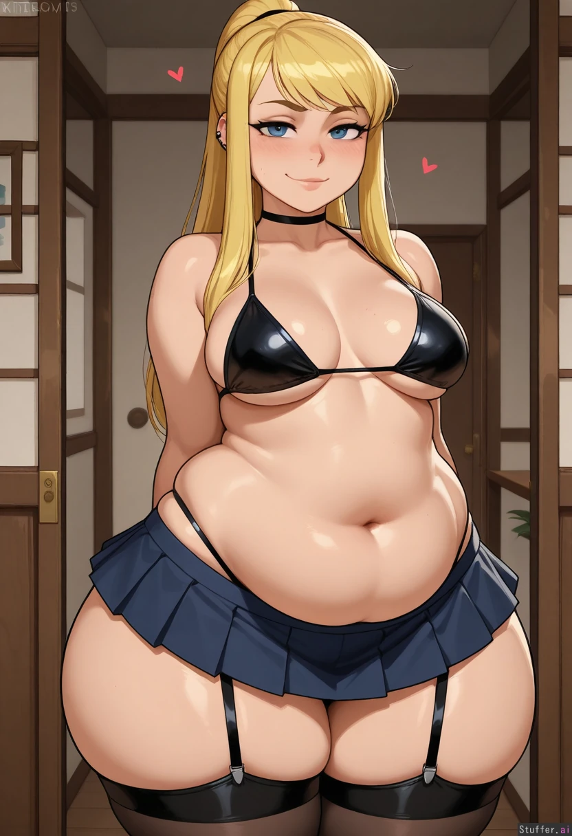 1girl, smirk, in_love, love_hearts, solo, indoors, highly detailed, masterpiece, high rating, (ohshinakai, doveymouse, Ninjart1st, bambooale, icarusillustrations, krekkov, kittew,), winry rockbell, black bikini top, black pleated mini skirt, (medium breasts), ((enormous thighs)), thigh high socks, garter_strap, ((((((bottom_heavy)))))), (((((wide_hips))))), (((((fat chunky)))))