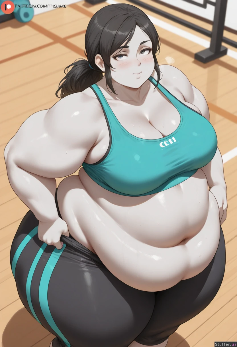 **general** (Best quality), (high rating), absurd res, high res, detailed, ultra quality, (high quality), masterpiece, stunning beauty, (((detailed face:1.3))), intricate detail, beautiful face, exquisite detail, absurd resolution, correct anatomy, 8k, high definition picture, (highly detailed face), highly detailed skin texture, detailed background, ((perfect human anatomy)), **artists** better-with-salt(artist), c.cu(artist), shexyo(artist), mdf_an(artist), araneesama(artist), cutesexyrobutts(artist), w-oo-t(artist),(artist), butty-butter(artist), coffeeslice(artist), **Character:** 1girl. Wii trainer, **Body Appearance:** ((large breasts:1.1)), freckles, ((chubby belly:1.7)), ((wide hips:1.9)), ((round chubby face:1.9)), bottomheavy, fat rolls, love handles, ((obese legs:2)), ((bulky limbs)), ((muffin_top)), ((thick thighs:1.8)), ((((fat arms:1.5)))), ((grey skin:2)), **eyes** Grey eyes. **Emotions:** blush, (ahegao), ((sweaty)), looking at viewer, **Hair/styles:** Long hair, messy hair, (black hair), **Clothes:** (((Yoga pants))), sports bra, **Setting:** Gym, **Actions:** standing, heavy breathing, sexual pose, pulling up pants, **Perspective::** ((From above)), ((from behind)), close to viewer,