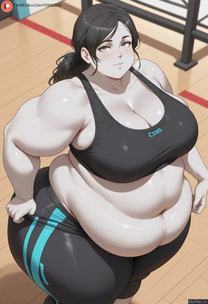 **general** (Best quality), (high rating), absurd res, high res, detailed, ultra quality, (high quality), masterpiece, stunning beauty, (((detailed face:1.3))), intricate detail, beautiful face, exquisite detail, absurd resolution, correct anatomy, 8k, high definition picture, (highly detailed face), highly detailed skin texture, detailed background, ((perfect human anatomy)), **artists** better-with-salt(artist), c.cu(artist), shexyo(artist), mdf_an(artist), araneesama(artist), cutesexyrobutts(artist), w-oo-t(artist),(artist), butty-butter(artist), coffeeslice(artist), **Character:** 1girl. Wii trainer, **Body Appearance:** ((large breasts:1.4)), freckles, ((chubby belly:1.7)), ((wide hips:1.9)), ((round chubby face:1.9)), bottomheavy, fat rolls, love handles, ((obese legs:2)), ((bulky limbs)), ((muffin_top)), ((thick thighs:1.8)), ((((fat arms:1.5)))), ((grey skin:2)), **eyes** Grey eyes. **Emotions:** blush, (ahegao), ((sweaty)), looking at viewer, **Hair/styles:** Long hair, messy hair, (black hair), **Clothes:** (((Yoga pants))), sports bra, **Setting:** Gym, **Actions:** standing, heavy breathing, sexual pose, pulling up pants, **Perspective::** ((From above)), ((from behind)), close to viewer,
