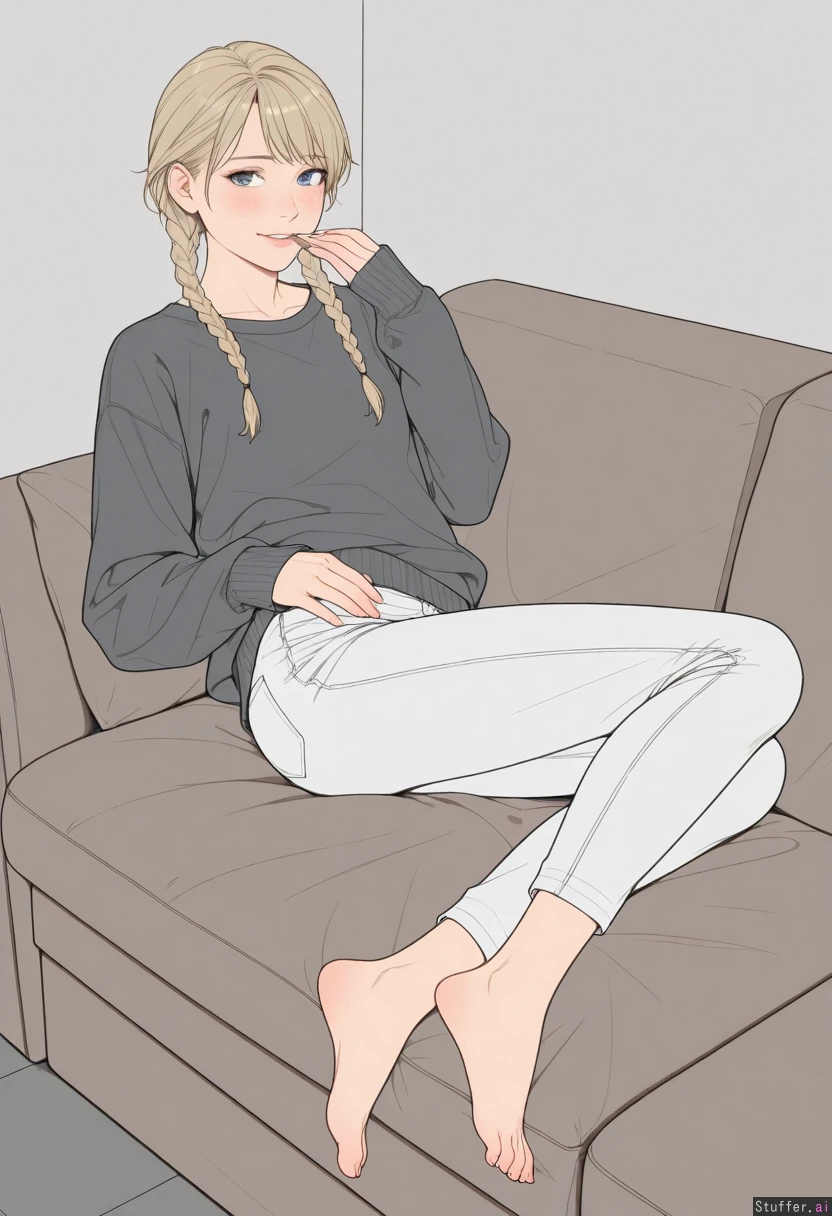 ((high quality, masterpiece, best quality, realistic digital art, detailed face, good anatomy, flat color, simple shading, realistic, no text, Solo, full body in view)) (1girl), (blue eyes), european, mature, ((tomboy)), ((lazy)) pale skin, blonde braids, fringe cut, 20 years old, nerdy, white jeans, dark grey wool sweater, barefoot, (shy, blushing, in love with you, smiling) ((healthy body, soft body, fit, flatchested)) (Lounging in sofa), (feet on ground), (legs in lazy position), Skinny, (chubby:0.90), hand_on_hip, eating,