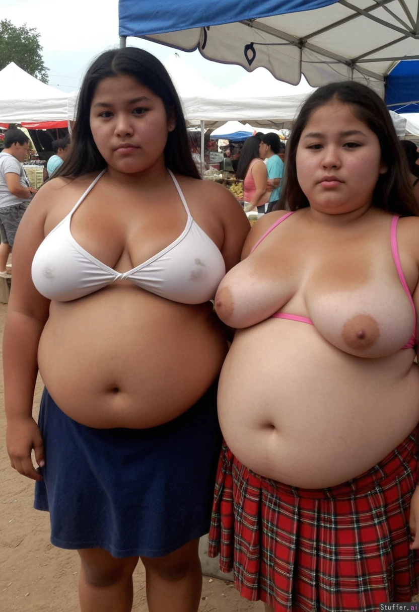A beautiful young obese 18-year-old fat nepalese student girl huge belly big chest with smooth skin, with her other fatter sister standing at dusty farmers market in bikini tops and low cut skirts, A very ordinary iPhone image; a sloppy snapshot. fat rounded belly focused shot. The photo has slight motion blur and is slightly uneven lighting. The overall effect is aggressively mediocre, realistic 4k