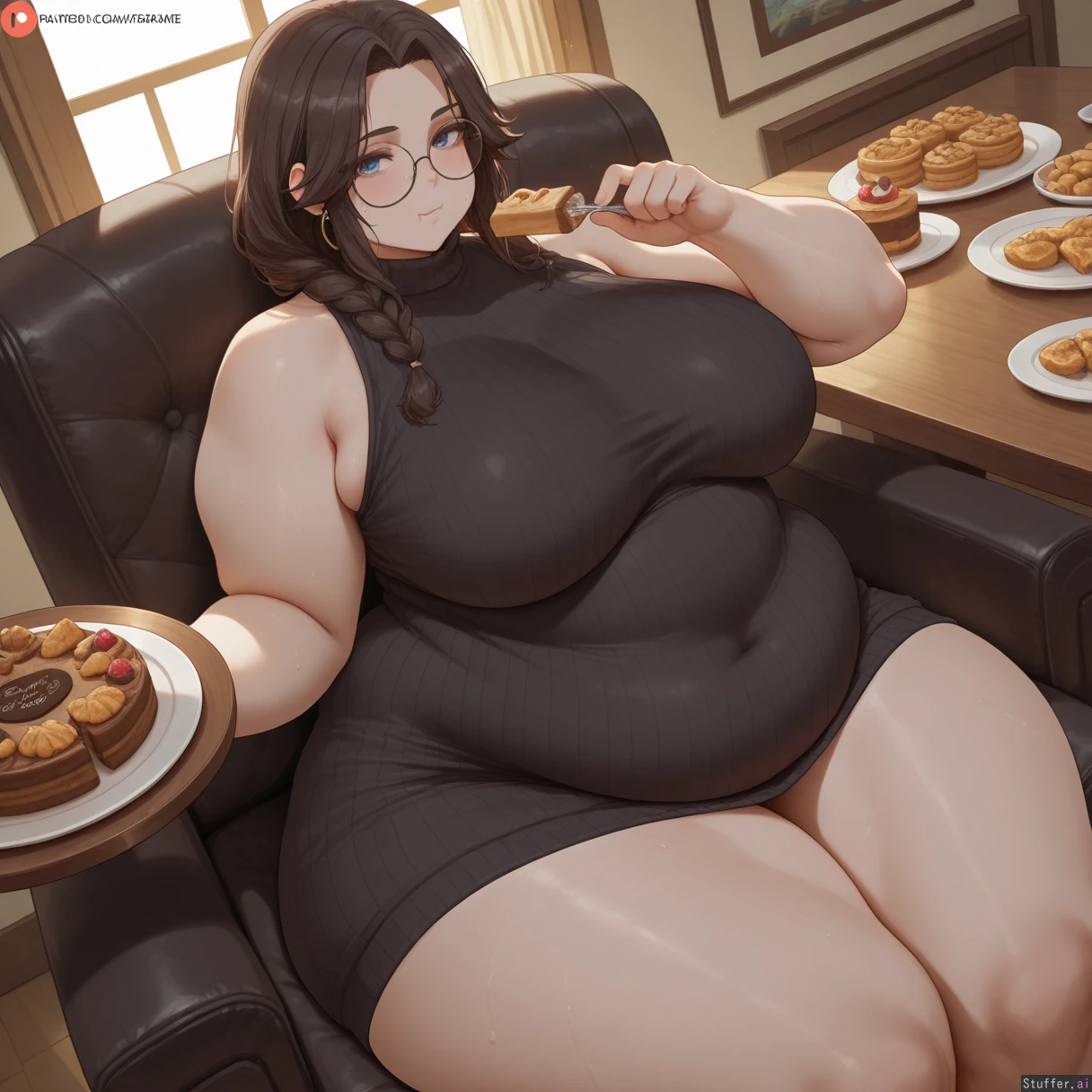 best quality), (high rating), absurd res, high res, detailed, ultra quality, (high quality), masterpiece, stunning beauty, (((detailed face))), intricate detail, beautiful face, exquisite detail, absurd resolution, correct anatomy, 8k, high definition picture, (highly detailed face), highly detailed skin texture, detailed background, (((perfect human anatomy))), ((perfect proportions)), better-with-salt(artist), c.cu(artist), shexyo(artist), mdf_an(artist), araneesama(artist), cutesexyrobutts(artist), w-oo-t(artist), assthethick(artist), butty-butter(artist), **Character:** 1girl. Solo. **Body Appearance:** ((wide hips:1.8)), bottomheavy, fat rolls, love handles, ((chubby belly:1.5)), ((obese:1.8)), ((bulky limbs)), ((thick thighs:1.8)), ((fat arms:1.5)), ((obese legs:1.8)), ((pale skin)), ((round chubby face:1.6))), **Eye:** blue eyes. **Emotions:** blush, horny, sweaty, ((embarrassed)) *Hair/Styles:** long hair, dark blonde, messy, **Clothes:** skin tight dress, (((fully clothed))), (((sweater dress))), ((((belly covered)))), round glasses, ((body covered)), jewelry **Setting:** Table, ((night)), cake, pastries, icecream, **Actions:** (sitting), sexual pose, looking at viewer, eating, **Perspective::** ((From above)), ((from side)), close to viewer,