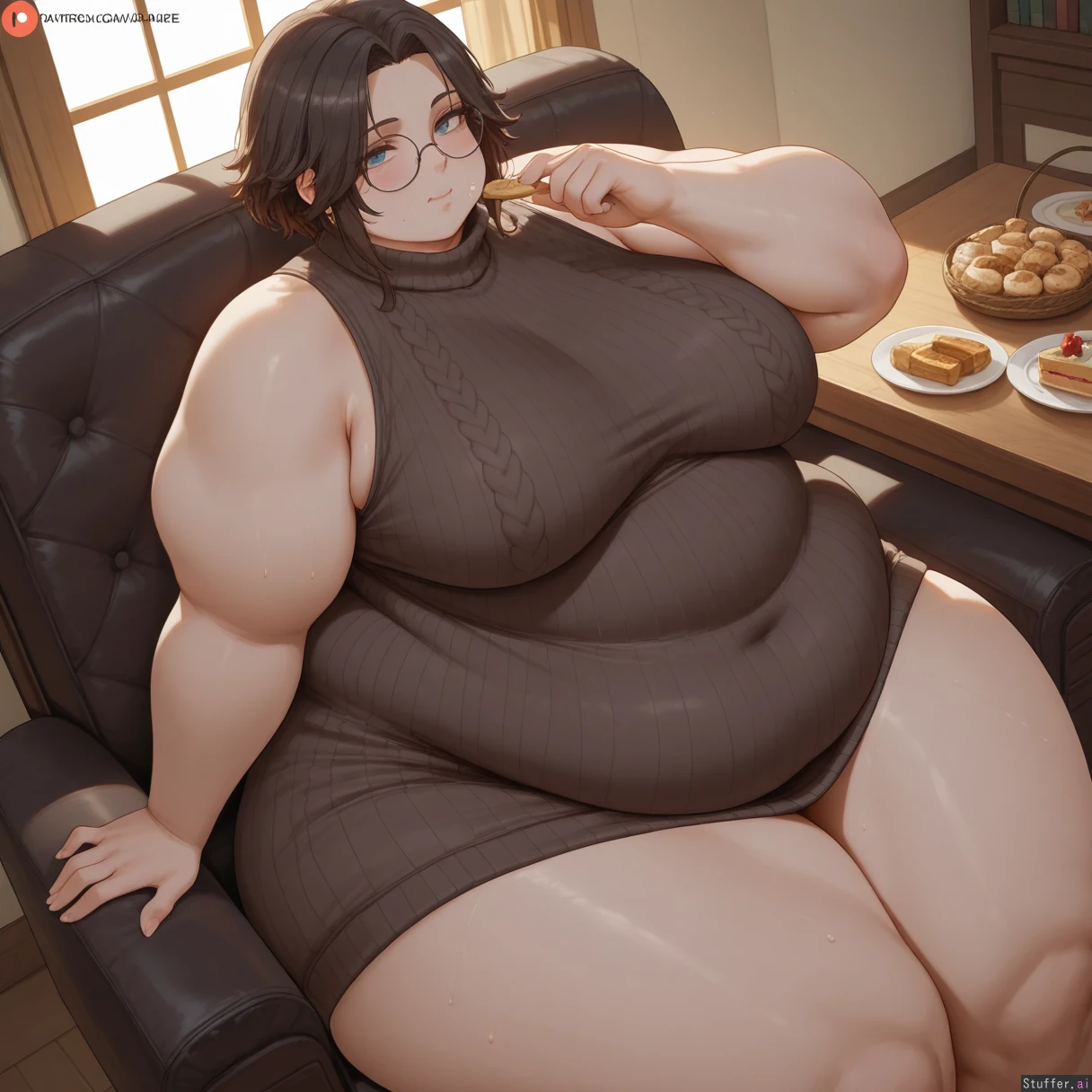 best quality), (high rating), absurd res, high res, detailed, ultra quality, (high quality), masterpiece, stunning beauty, (((detailed face))), intricate detail, beautiful face, exquisite detail, absurd resolution, correct anatomy, 8k, high definition picture, (highly detailed face), highly detailed skin texture, detailed background, (((perfect human anatomy))), ((perfect proportions)), better-with-salt(artist), c.cu(artist), shexyo(artist), mdf_an(artist), araneesama(artist), cutesexyrobutts(artist), w-oo-t(artist), assthethick(artist), butty-butter(artist), **Character:** 1girl. Solo. **Body Appearance:** ((wide hips:1.8)), bottomheavy, fat rolls, love handles, ((chubby belly:1.5)), ((obese:2.4)), ((bulky limbs)), ((thick thighs:1.8)), ((fat arms:1.5)), ((obese legs:1.8)), ((pale skin)), ((round chubby face:1.6))), **Eye:** blue eyes. **Emotions:** blush, horny, sweaty, ((embarrassed)) *Hair/Styles:** long hair, dark blonde, messy, **Clothes:** skin tight dress, (((fully clothed))), (((sweater dress))), ((((belly covered)))), round glasses, ((body covered)), jewelry **Setting:** Table, ((night)), cake, pastries, icecream, **Actions:** (sitting), sexual pose, looking at viewer, eating, **Perspective::** ((From above)), ((from side)), close to viewer,