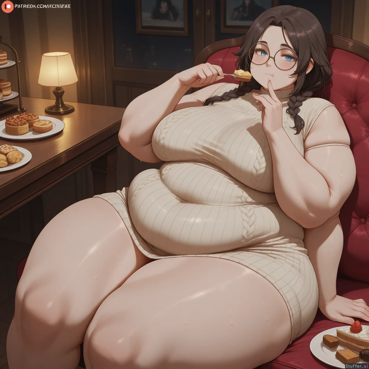 best quality), (high rating), absurd res, high res, detailed, ultra quality, (high quality), masterpiece, stunning beauty, (((detailed face))), intricate detail, beautiful face, exquisite detail, absurd resolution, correct anatomy, 8k, high definition picture, (highly detailed face), highly detailed skin texture, detailed background, (((perfect human anatomy))), ((perfect proportions)), better-with-salt(artist), c.cu(artist), shexyo(artist), mdf_an(artist), araneesama(artist), cutesexyrobutts(artist), w-oo-t(artist), assthethick(artist), butty-butter(artist), **Character:** 1girl. Solo. **Body Appearance:** ((wide hips:1.8)), bottomheavy, fat rolls, love handles, ((chubby belly:1.5)), ((obese:1.5)), ((bulky limbs)), ((thick thighs:1.8)), ((fat arms:1.5)), ((obese legs:1.8)), ((pale skin)), ((round chubby face:1.6))), **Eye:** blue eyes. **Emotions:** blush, horny, sweaty, ((embarrassed)) *Hair/Styles:** long hair, dark blonde, messy, **Clothes:** skin tight dress, (((fully clothed))), (((sweater dress))), ((((belly covered)))), round glasses, ((body covered)), jewelry **Setting:** Table, ((night)), cake, pastries, icecream, **Actions:** (sitting), sexual pose, looking at viewer, eating, **Perspective::** ((From above)), ((from side)), close to viewer,