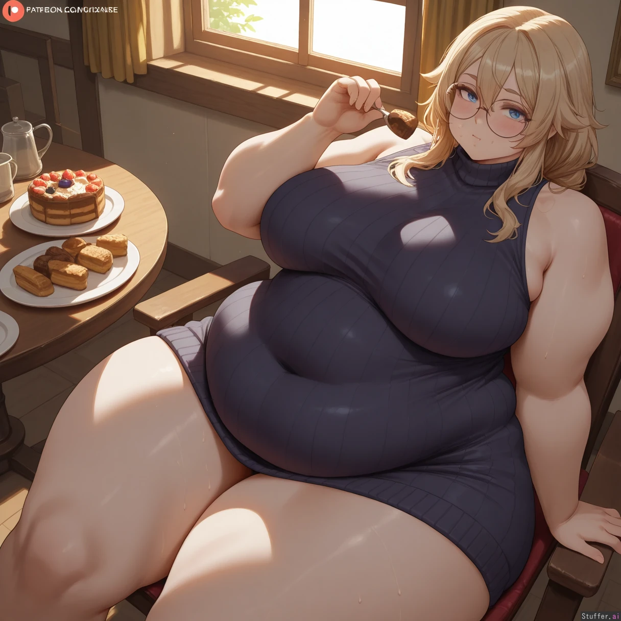 best quality), (high rating), absurd res, high res, detailed, ultra quality, (high quality), masterpiece, stunning beauty, (((detailed face))), intricate detail, beautiful face, exquisite detail, absurd resolution, correct anatomy, 8k, high definition picture, (highly detailed face), highly detailed skin texture, detailed background, (((perfect human anatomy))), ((perfect proportions)), better-with-salt(artist), c.cu(artist), shexyo(artist), mdf_an(artist), araneesama(artist), cutesexyrobutts(artist), w-oo-t(artist), assthethick(artist), butty-butter(artist), **Character:** 1girl. Solo. **Body Appearance:** ((wide hips:1.8)), bottomheavy, fat rolls, love handles, ((chubby belly:2)), ((obese:1.6)), ((bulky limbs)), ((thick thighs:1.8)), ((fat arms:1.5)), ((obese legs:1.8)), ((pale skin)), ((round chubby face:1.6))), **Eye:** blue eyes. **Emotions:** blush, horny, sweaty, ((embarrassed)) *Hair/Styles:** long hair, light brown, messy, **Clothes:** skin tight dress, (((fully clothed))), (((sweater dress))), ((((belly covered)))), round glasses, ((body covered)), jewelry **Setting:** Table, ((night)), cake, pastries, icecream, **Actions:** (sitting), sexual pose, looking at viewer, eating, **Perspective::** ((From above)), ((from side)), close to viewer,