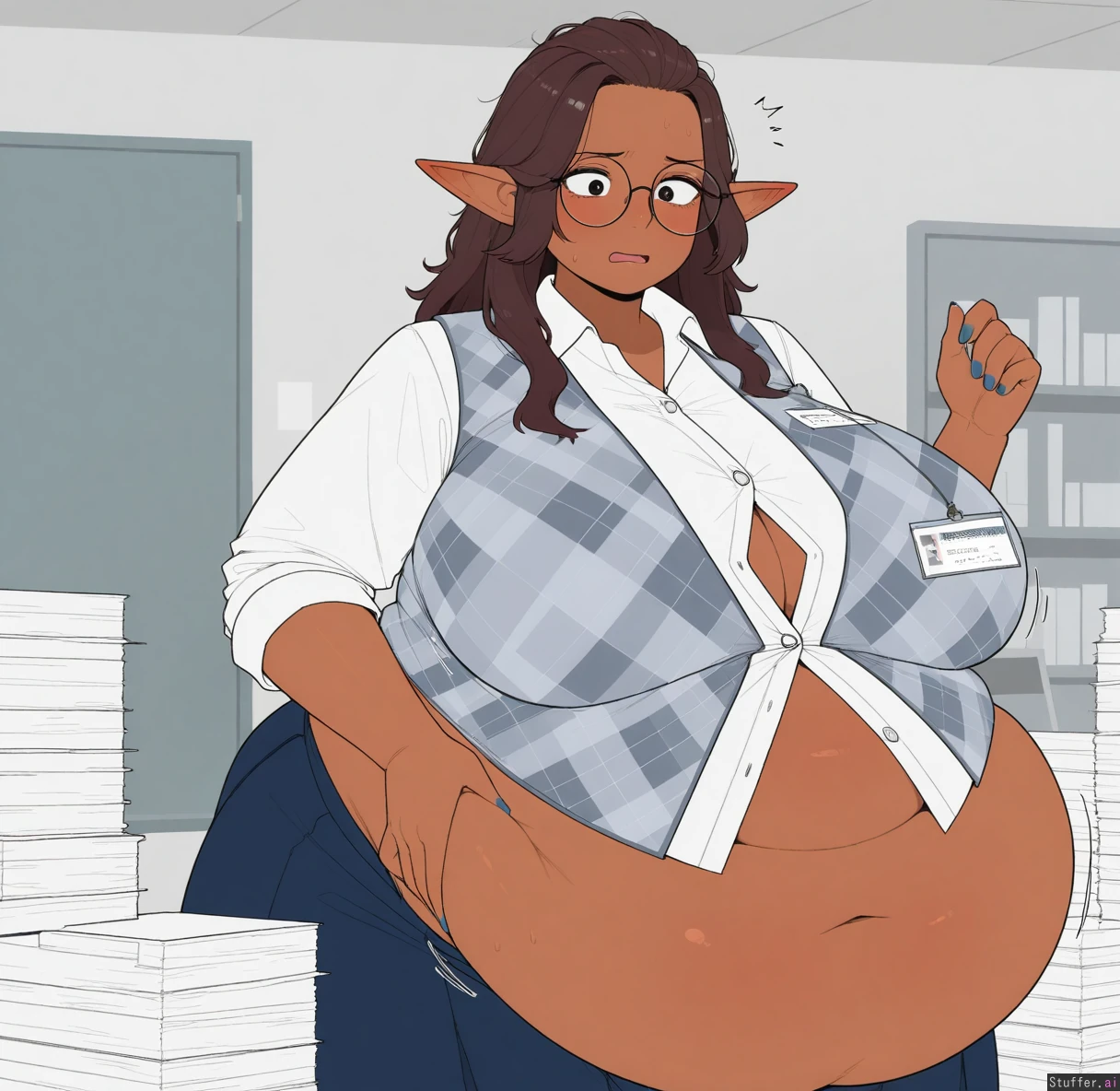 uhd, high resolution, flawless, best_quality, (hdr), (long eyelashes, makeup:1.2) (flat_color, lineless:1.4), perfect anatomy, beautiful face, beautiful eyes, Tweedabop(artist), (ohasi_art), (betterwithsalt), w-oo-t(artist), perfect hands ((Solo)), ((mature)) Elf, ((dark brown skin)), pulled back hair, brown hair, red hair highlights, frizzy hair, mousey hair, blue nails, navy blue skirt, circular glasses, lab assistant, argyle vest, Science lab, stacks of paper Shy, nervous, surprised, ((uncomfortable)), yelling for help Shirt untucked ((Button gap)) (((Weight gain))) (((Belly expansion))) ((Huge belly)) ((((Obese)))) (Breast expansion)
