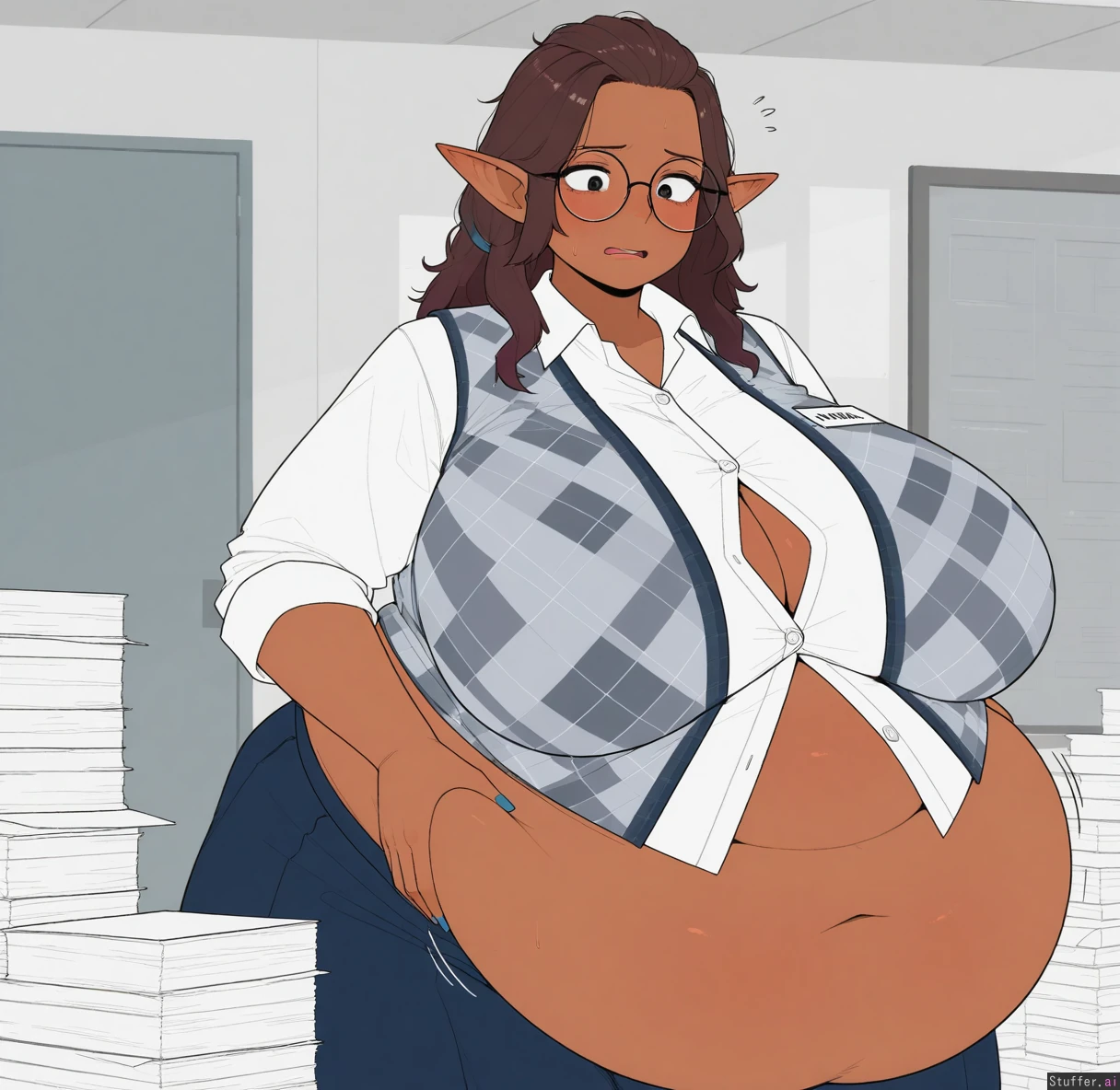 uhd, high resolution, flawless, best_quality, (hdr), (long eyelashes, makeup:1.2) (flat_color, lineless:1.4), perfect anatomy, beautiful face, beautiful eyes, Tweedabop(artist), (ohasi_art), (betterwithsalt), w-oo-t(artist), perfect hands ((Solo)), ((mature)) Elf, ((dark brown skin)), pulled back hair, brown hair, red hair highlights, frizzy hair, mousey hair, blue nails, navy blue skirt, circular glasses, lab assistant, argyle vest, Science lab, stacks of paper Shy, nervous, surprised, ((uncomfortable)), yelling for help Shirt untucked ((Button gap)) (((Weight gain))) (((Belly expansion))) ((Huge belly)) ((((Obese)))) (Breast expansion) Gigantic breasts