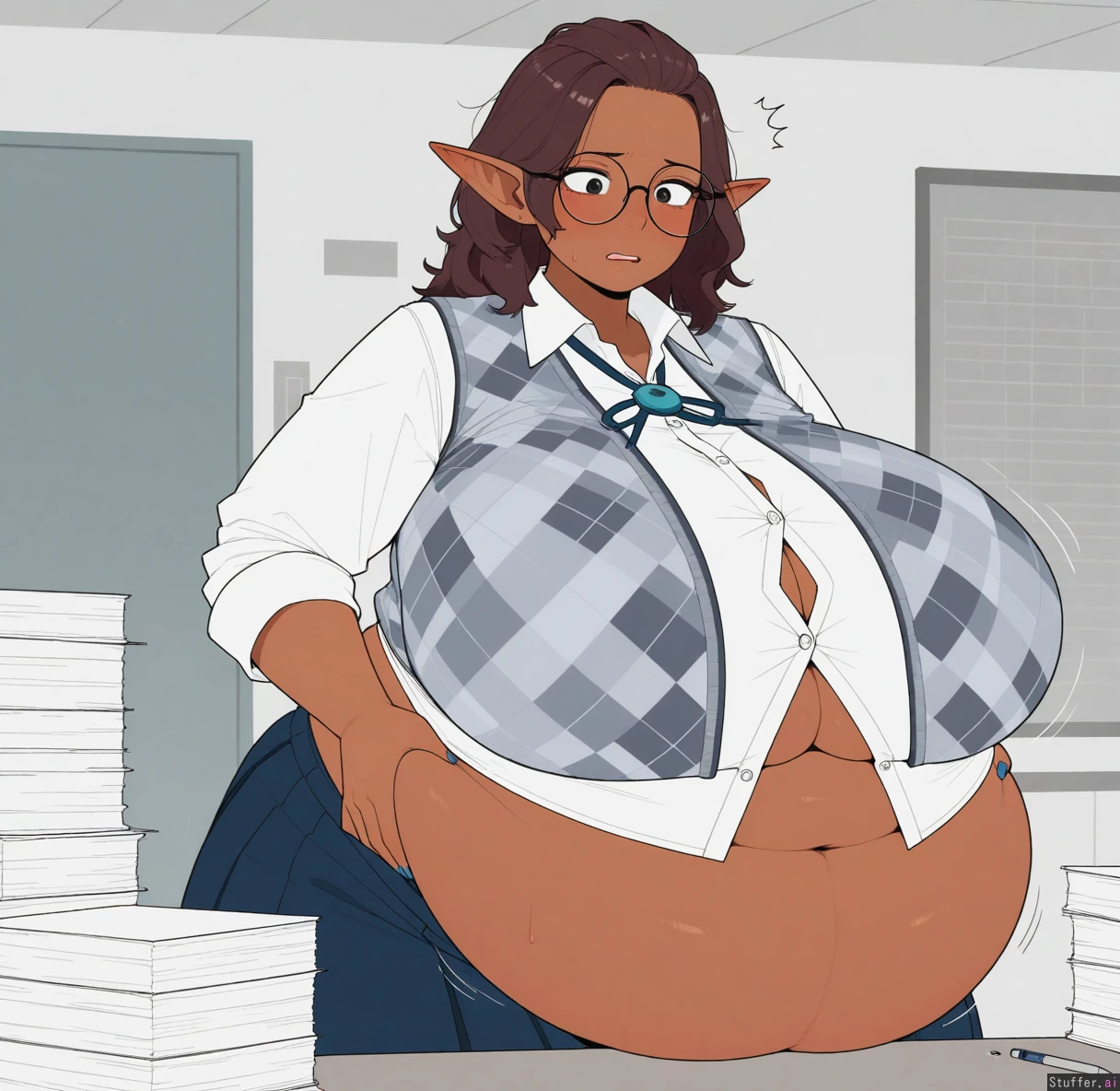 uhd, high resolution, flawless, best_quality, (hdr), (long eyelashes, makeup:1.2) (flat_color, lineless:1.4), perfect anatomy, beautiful face, beautiful eyes, Tweedabop(artist), (ohasi_art), (betterwithsalt), w-oo-t(artist), perfect hands ((Solo)), ((mature)) Elf, ((dark brown skin)), pulled back hair, brown hair, red hair highlights, frizzy hair, mousey hair, blue nails, navy blue skirt, circular glasses, lab assistant, argyle vest, Science lab, stacks of paper Shy, nervous, surprised, ((uncomfortable)), yelling for help Shirt untucked ((Button gap)) (((Weight gain))) (((Belly expansion))) ((Huge belly)) ((((Obese)))) ((Breast expansion)) (Gigantic breasts) ((Underboob))