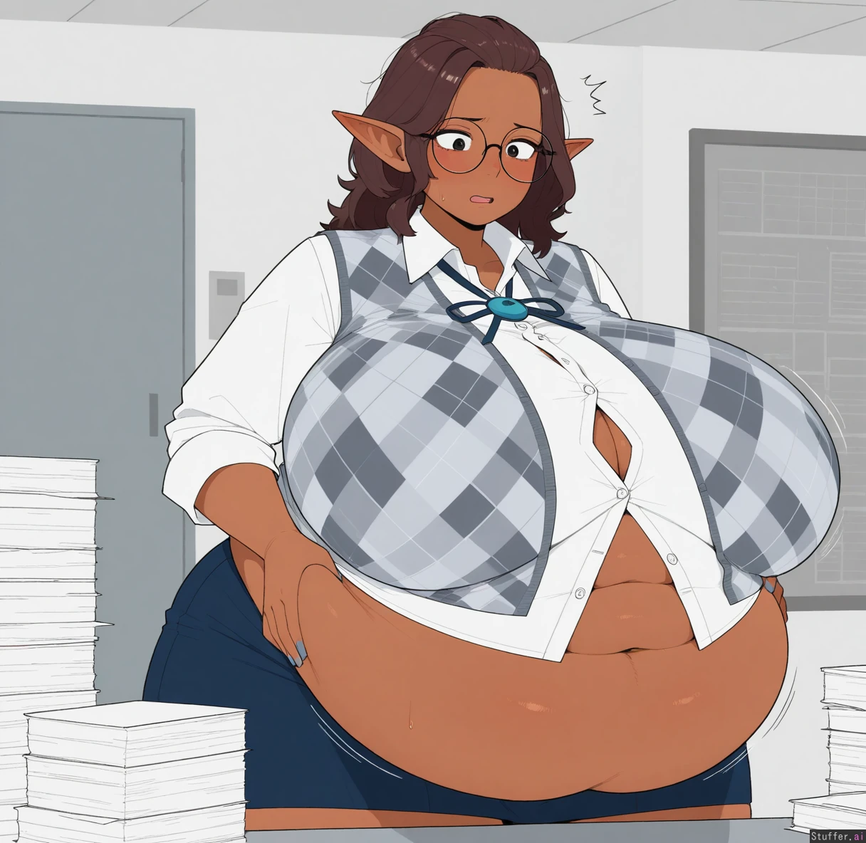 uhd, high resolution, flawless, best_quality, (hdr), (long eyelashes, makeup:1.2) (flat_color, lineless:1.4), perfect anatomy, beautiful face, beautiful eyes, Tweedabop(artist), (ohasi_art), (betterwithsalt), w-oo-t(artist), perfect hands ((Solo)), ((mature)) Elf, ((dark brown skin)), pulled back hair, brown hair, red hair highlights, frizzy hair, mousey hair, blue nails, navy blue skirt, circular glasses, lab assistant, argyle vest, Science lab, stacks of paper Shy, nervous, surprised, ((uncomfortable)), yelling for help Shirt untucked ((Button gap)) (((Weight gain))) (((Belly expansion))) ((Huge belly)) ((((Obese)))) (((Breast expansion))) (Gigantic breasts) ((Underboob))