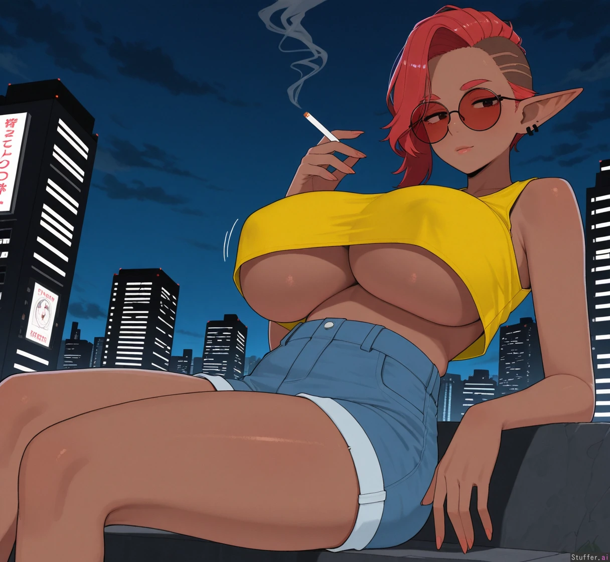 uhd, high resolution, flawless, best_quality, (hdr), (long eyelashes, makeup:1.2) (flat_color, lineless:1.4), perfect anatomy, beautiful face, beautiful eyes, Tweedabop(artist), (ohasi_art), (betterwithsalt), w-oo-t(artist), perfect hands ((Solo)), ((mature)) Elf, ((dark brown skin)), red hair, mohawk, red sunglasses, thick eyebrows Yellow crop top, underboob Bright blue high waisted shorts Cyberpunk city Smoking cigarette, looking at the city, night, cloudy Breast expansion