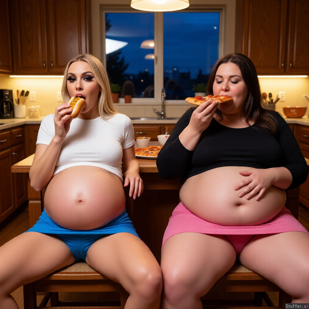 ultra realistic evening lighting, ultra photo realistic, kitchen background, front view on the left: blonde skinny girl, tight white top, tight blue mini skirt, heavy makeup, eating hotdogs, (((extremely giant and round pregnant exposed belly))), sitting on a chair, spread legs, arched back on the right: brunette extremely obese woman, tight black top, tight pink skirt, eating pizza, (((extremely fat exposed belly))), sitting on a chair, spread legs