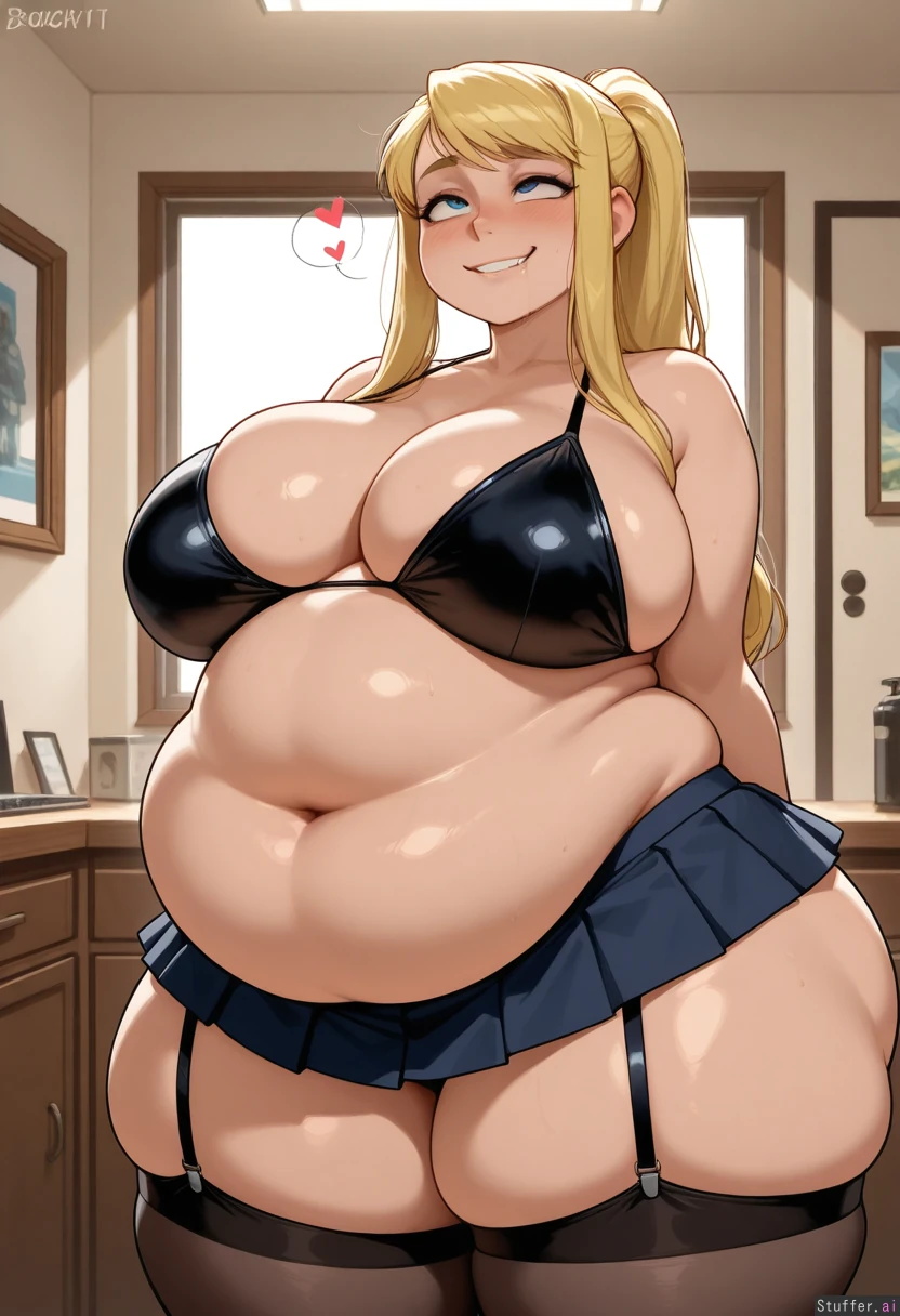 1girl, (ahegao), in_love, love_hearts, solo, indoors, highly detailed, masterpiece, high rating, (ohshinakai, doveymouse, Ninjart1st, bambooale, icarusillustrations, krekkov, kittew,), winry rockbell, black bikini top, black pleated mini skirt, ( fat breasts), (((((enormous thighs))))), thigh high socks, garter_strap, (((bottom_heavy))), (((wide_hips))), (((sbbw))), (round_ass_visible_from_front), (((((fat belly))))), ((doughy flabby belly)), ((((chunky and fat)))), (((proud of how fat she is))),, ((lip bite grin drool))