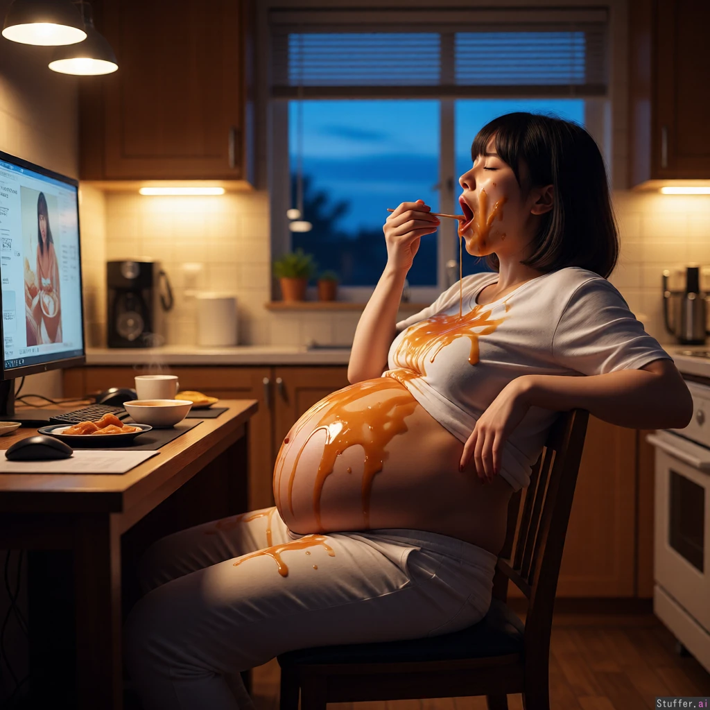 ultra realistic evening lighting, kitchen background, side view japanese woman, mukbang eater, sitting on a chair in front of monitor, eating, (((extremely giant and round pregnant exposed belly ready to burst))), arched back, lean on a chair, her clothes and mouth smeared with sauce, moaning, sauce flowing from her mouth
