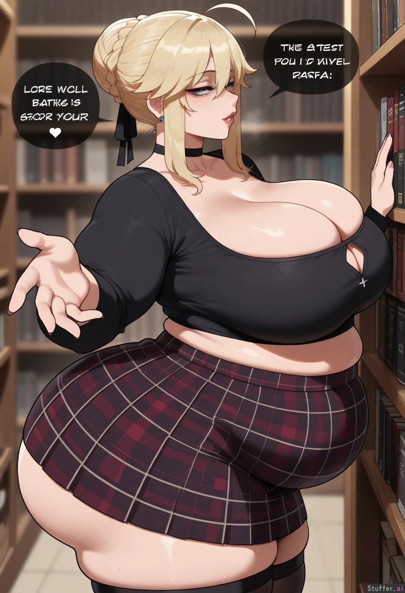 ((Solo, 1 woman)), ((nyantcha)))), (krekkov), c.cu(artist), araneesama(artist), 8k, high resolution, gorgeous, masterpiece, ((flawless)), (((high rating))), ((highly detailed face)), beautiful face, ((((fat female)))), ((((thick girl)))), (((steamy))), (((skindentation))), ((((solo_female)))) , (((Artoria pendragon))),(fate dtay noght), ((Cleavage)), (((Black blouse, plaid skirt, jewelry)), ((fully clothed)), (((Morbidly obese:1.3))), ((big breasts)), ((massive thighs)), ((wide hips)), fat arms, ((voluptuous)), ((huge fat ass)), sweaty, (((Sexy, seductive))), (((((panting))))), in library, reaching for object, leaning forward, side view,