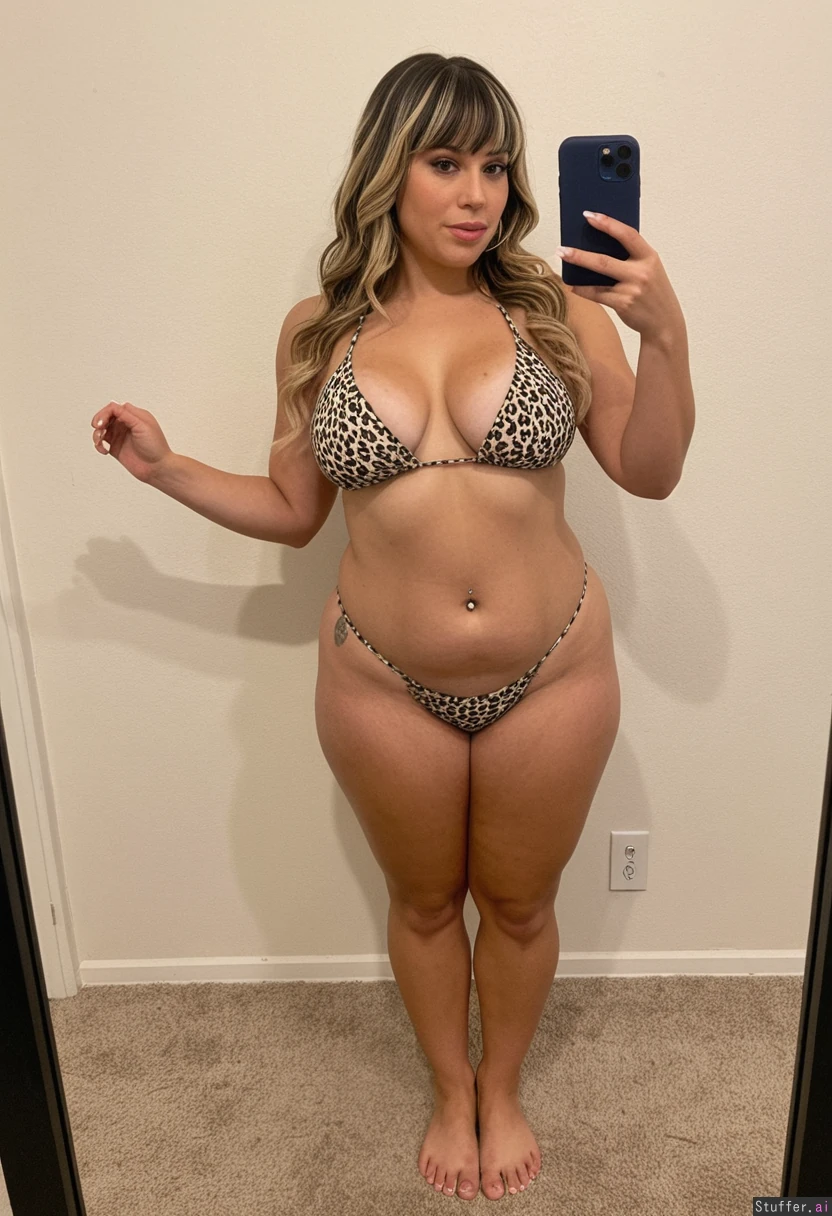 A short statured gorgeous (beautiful popular girl model face) Latina woman in her early thirties with dark long wavy hair and blonde streaks with bangs wearing a cheetah print bikini barefoot toes painted white, Standing taking a selfie. She is a shortstack , pear-shaped_figure , (wide hips) (big thick thighs) (bellybutton piercing) (thick) (bottom heavy) (toned) (stretch marks) Real life, realistic , best_quality
