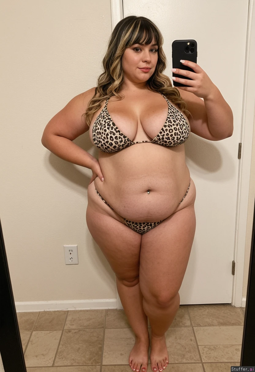 A short statured gorgeous (beautiful popular girl model face) Latina woman in her early thirties with dark long wavy hair and blonde streaks with bangs wearing a cheetah print bikini barefoot toes painted white, Standing taking a selfie. She is a shortstack , pear-shaped_figure , (wide hips) (huge thick fat thighs) (bellybutton piercing) (morbidly obese) (very bottom heavy) (very flabby) (stretch marks) (sagging tits) (cellulite) Real life, realistic , best_quality