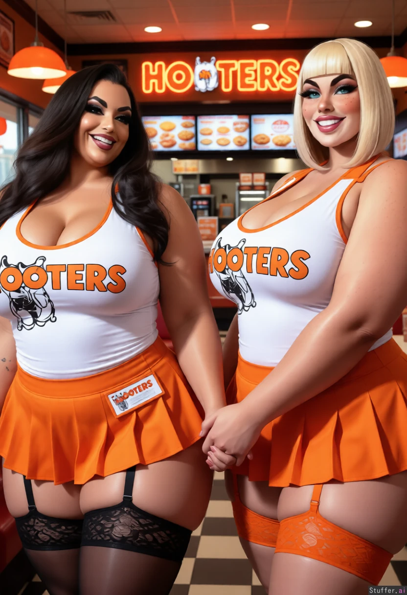 Dress the girls in a sexy Hooters uniform, hooters restaurant in background , maintain their original physical forms