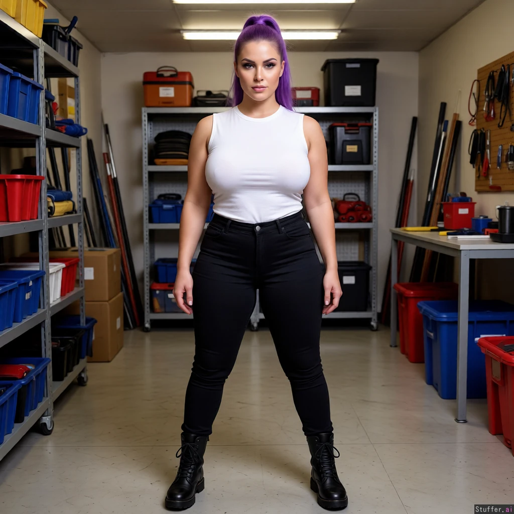 curvy girl, beautiful face, light makeup, violet hair, hight ponytail, wearing white sleeveless T-shirt, black pants and black military boots, big breast, big hips, utility room background, front view