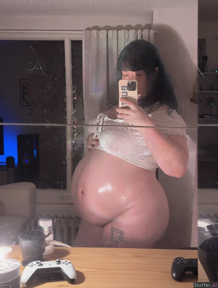 Enlarge the belly, Add realistic tight, overstretched skin: shiny/taut surface with glossy highlights where light reflects visible subtle, natural navel stretched flat or outward. Keep the belly shape natural and firm-looking with proper weight distribution and realistic shadowing/folds. Strictly preserve every other detail pixel-perfect and unchanged: woman's exact face (features, eyes, smile, gaze, red-brown hair length/color), hands covering breasts in the precise same cupped position, arms/shoulders, skin tone/texture on non-belly areas, full living room background (couch, TV with blue glow, speakers, game controllers, wooden table, ceiling texture), lighting direction, shadows, and overall composition/framing. No distortions, no changes, no additions outside the abdominal region high-fidelity preservation of all non-belly elements.