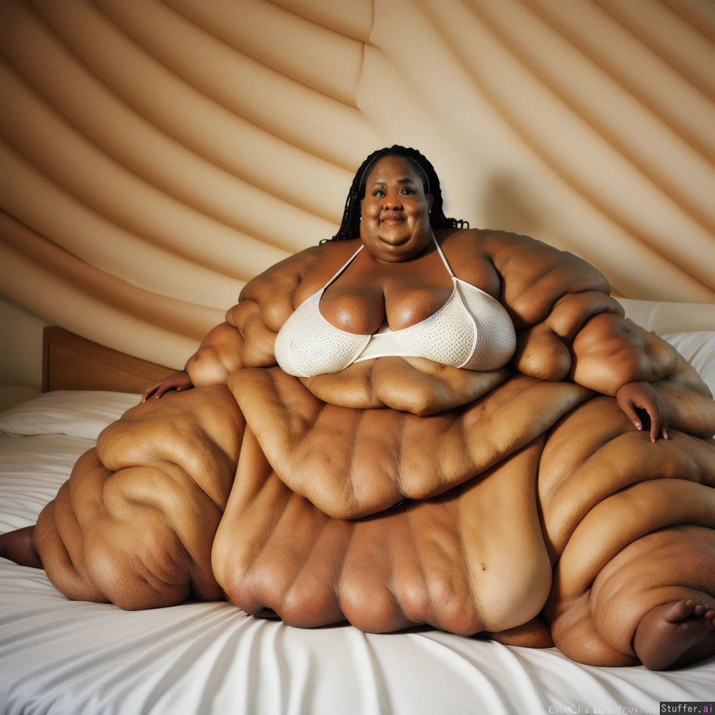 Photo realistic, ultra high quality, african ssbbw, beautiful face:1.4, (ultra double chin:1.9), (ultra fat face:1.9), ultra huge legs:1.9), (ultra huge arms:1.9), (ultra leg rolls:1.7), wearing a white bikini, sitting on a bed, (full body shot:1.4),