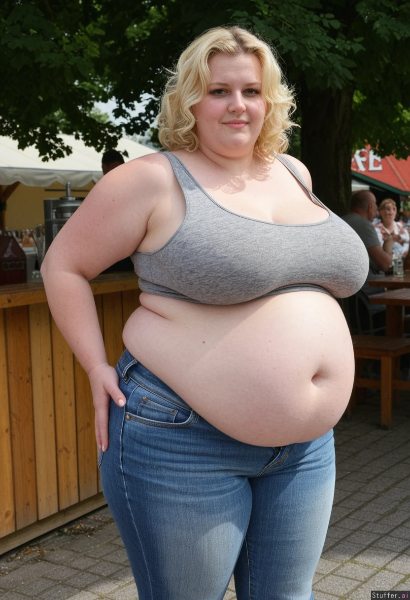 blonde short_wavy_hair obese huge_belly huge_breasts huge_thighs wearing_jeans_and_plain_grey_tanktop standing _in_outdoor_munich_biergarten