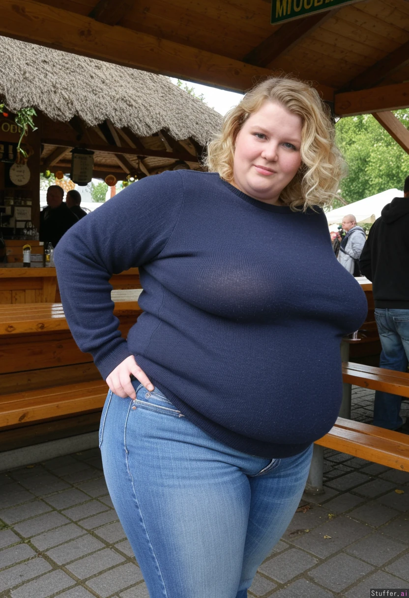 blonde short_wavy_hair super_massive_huge_obese super_massive_huge_obese wearing_jeans_and_plain_navyblue_sweater standing _in_outdoor_munich_biergarten