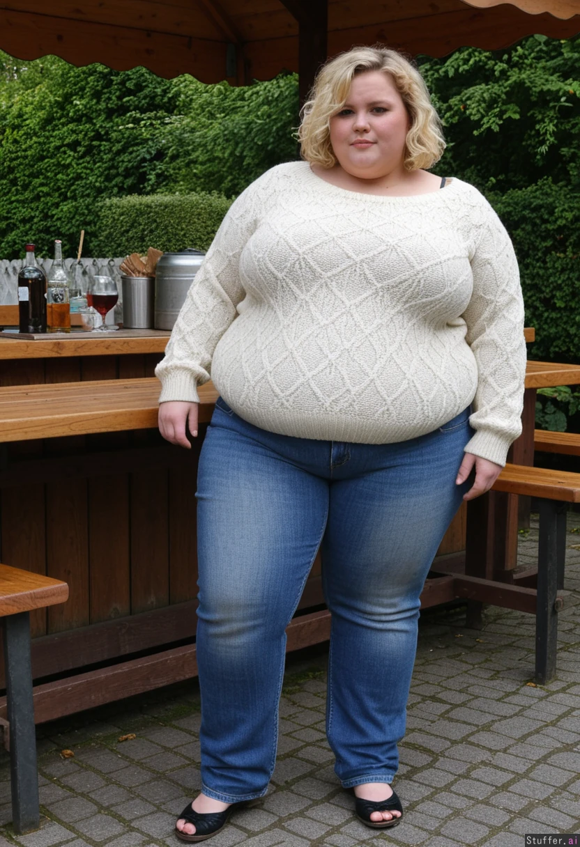 blonde short_wavy_hair super_massive_huge_obese super_massive_huge_obese wearing_jeans_and_nordic_sweater standing _in_outdoor_munich_biergarten