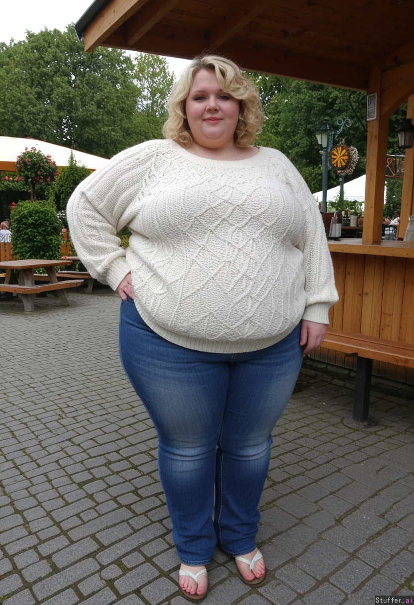 blonde short_wavy_hair super_massive_huge_obese super_massive_huge_obese massive_fat_obese wearing_jeans_and_nordic_sweater standing _in_outdoor_munich_biergarten