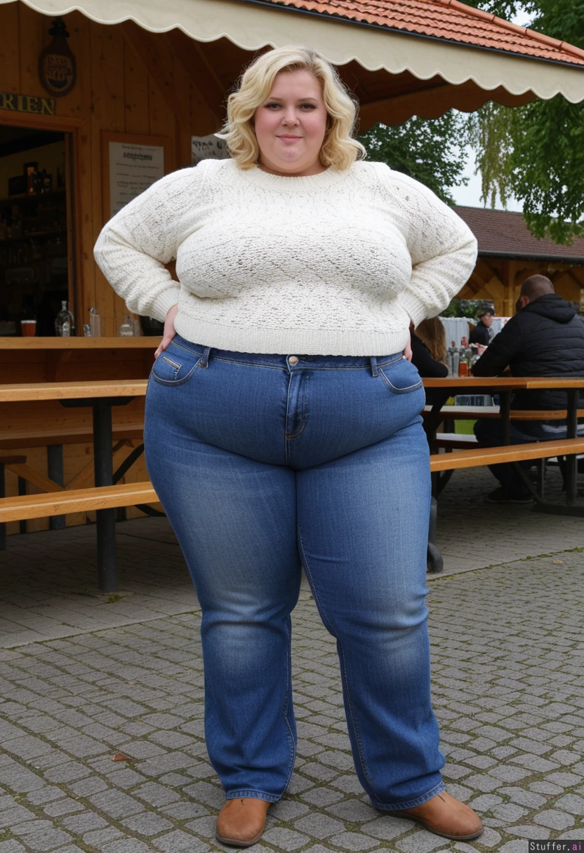 blonde short_wavy_hair super_massive_huge_obese super_massive_huge_obese massive_fat_obese wearing_jeans_and_nordic_sweater standing _in_outdoor_munich_biergarten