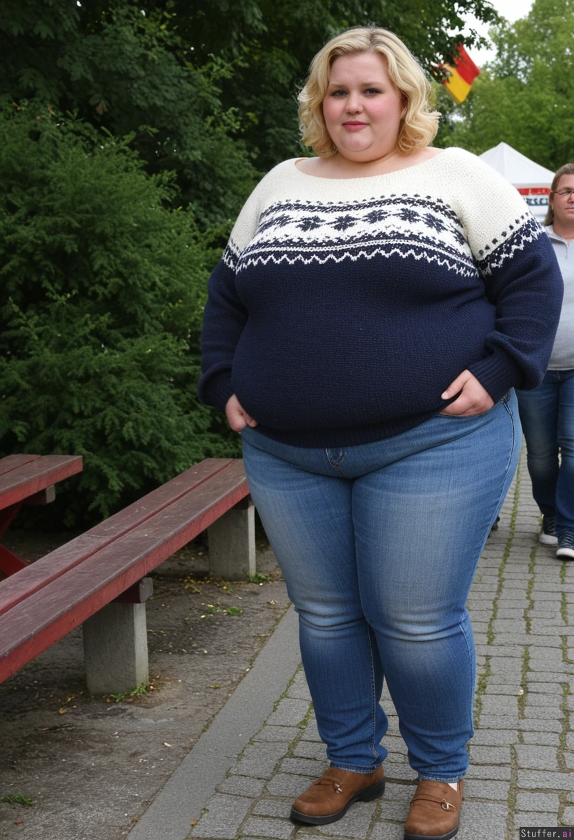 blonde short_wavy_hair super_massive_huge_obese super_massive_huge_obese massive_fat_obese wearing_jeans_and_nordic_sweater standing _in_outdoor_munich_biergarten