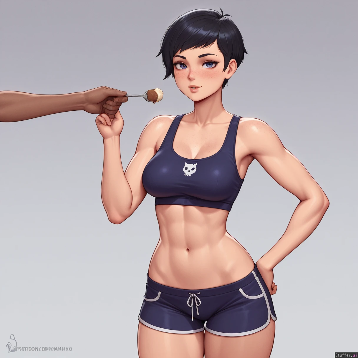 speedl00ver, kittew, prywinko, best_quality, Femboy, purple_eyes, freckles, brown_skin, black sideswept pixie_cut, heavy_blush, wide_hips, feeding