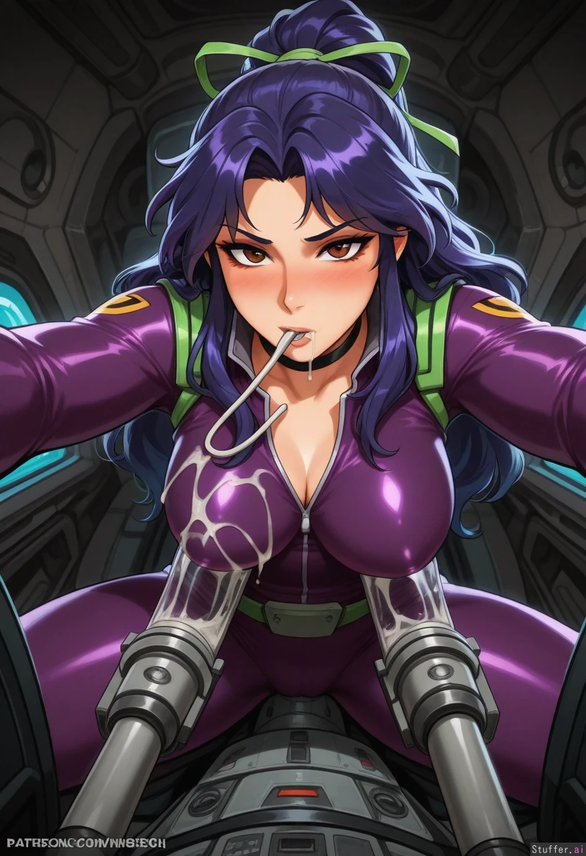 masterpiece,best quality,amazing quality, (((Katsuragi_misato))), ((eyeliner)), choker, drunk, cum_drip, (((purple spandex suit, inside cockpit, sucking on feeding tube attached to machine))) ((reiq(artist)): 1.0), ((Blushyspicy(artist)): 0.6), (((sideboob), (underboob), (belly_bursting_out_of_clothes), (belly_overhang), (large_breasts), (gigantic_belly), (thick_thighs), (morbidly_obese), (love_handles), (weight_gain)): 0.00),