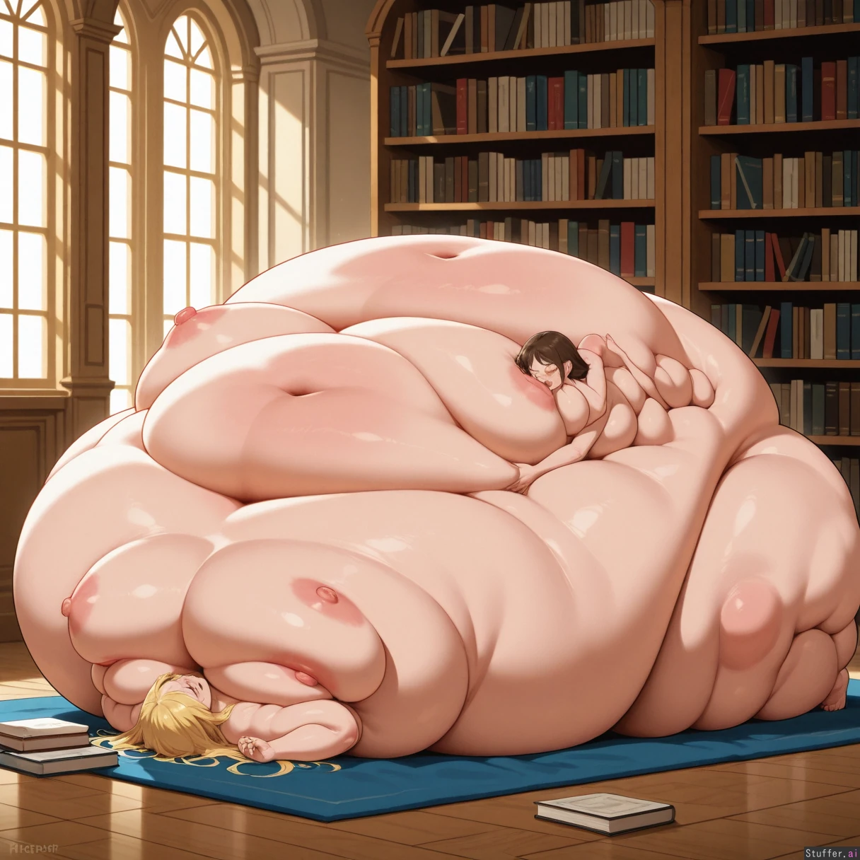Lesbian_couple, yuri, grabbing_belly, (((fully nude))) Arguing, library, blonde_hair, (((Laying down))) ((Hyper_chubby_belly: 0.8)) (((Hyper morbidly obese:1.4))) ((Hyper voluptuous:0.8)) ((growing belly:0.9)), ((overfed)), ((full belly:0.8)), ((tigh belly:1.2)), ((round belly:1.2)), ((expanding belly:0.6)) (blush), ((((big round belly)))), thick thighs, ((gigantic pregnant belly:0.6)), ((gigantic engorged breasts:0.8)), nipple bulge, ((chubby)),