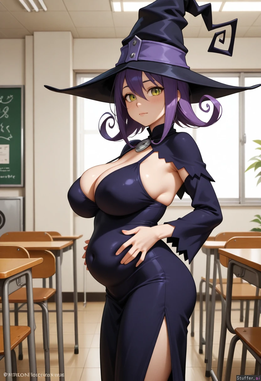 Blair_soul_eater, standing, hands_on_belly, sagging_breasts, at a cafeteria, horny_female, highly detailed, witch, looking_at_viewer , horny_expression:1.3, side_view , witch_dress