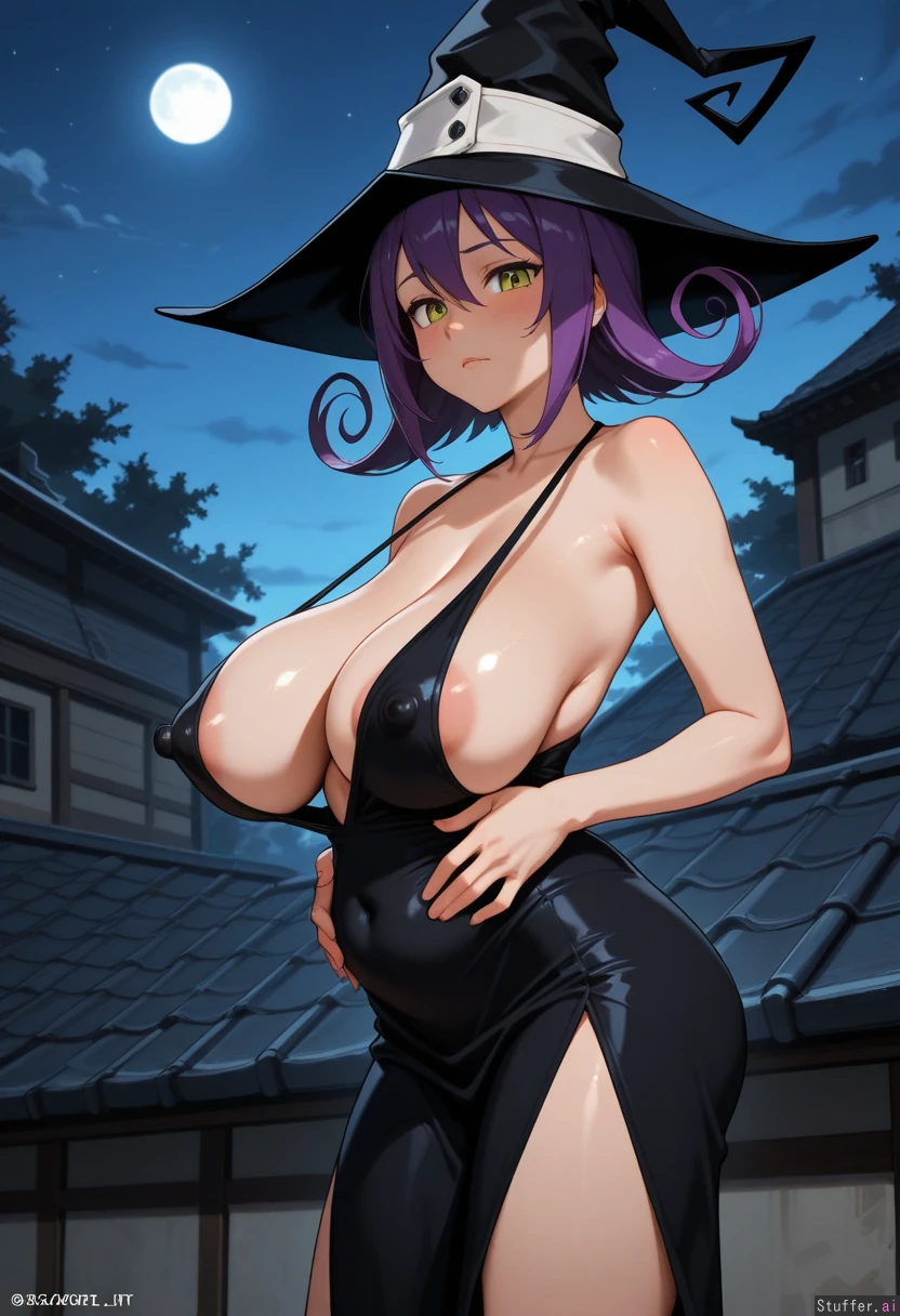 Blair_soul_eater, standing, hands_on_belly, (sagging_breasts:1.64), at a roof, night, horny_female, highly detailed, witch, looking_at_viewer , provocative_expression:1.3, side_view , witch_dress, (erect_nipples_under_dress:1.4 ),