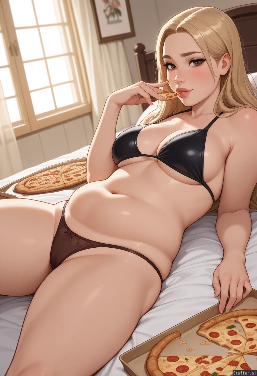 ((High quality Illustration, solo, 1 woman)), (perfect proportions, perfect anatomy), solo girl, (pewbutt(artist):1.5), (KAMII MOMORU( artist):1.1), (kittew(artist):1.0), (reiq(artist)), (detailed fingers), (detailed eyes), (detailed lips), (((Korean woman, asian_female, browneyes, freckles, long brown-blonde hair))),(((bangs))), ((Bedroom)), dim lighting, warm lighting, ((lounging on the bed)), ((laying)), (lazy), (relaxed), (((Black bikini top, brown panties))) ((Shy expression)), (cookies scattered), (trash scattered), (lots of pizza), ((Curvy), (chubby:1.50), (muffintop), (deep navel), (saggy belly), (belly_hang), (((((Sideview)))))
