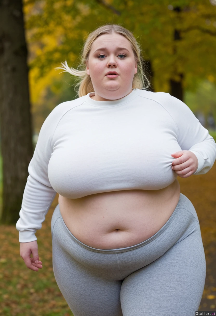(22-year-old) German girl, attractive, symmetrical-face, good-features, blue-eyes, blonde, nordic-look, fat-face, double chin, adipose, chubby-cheeks curvy, fertile, fat, (175kg) wearing a white plus-size sweater, grey sweatpants , running in a park, exercise, sweating, out of breath, huffing and puffing 4k-masterpiece, best-quality, good-lighting, film-grain, bokeh, blurry-background, three-quarter-view, candid, snapshot