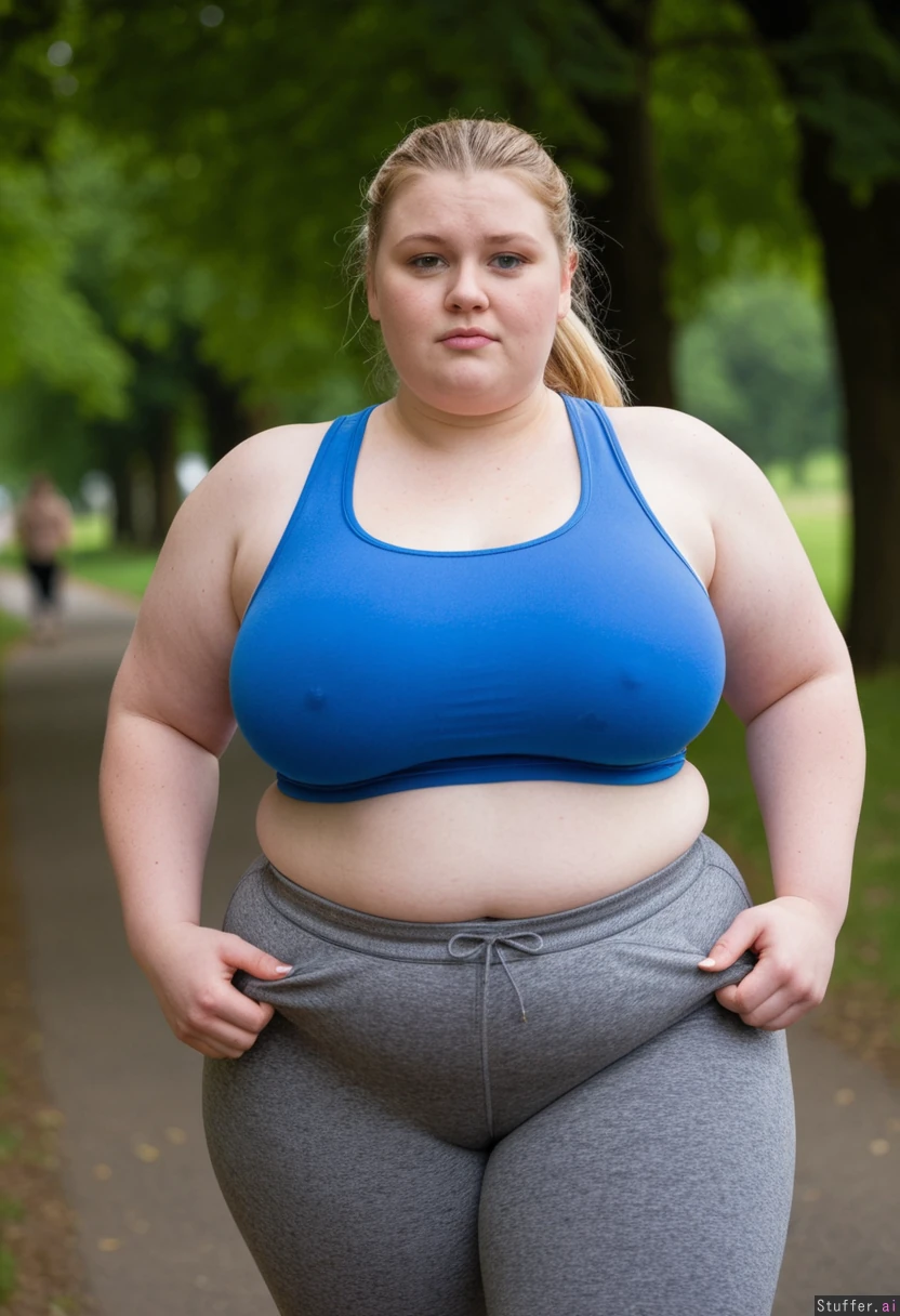 (22-year-old) German girl, attractive, symmetrical-face, good-features, blue-eyes, blonde, nordic-look, fat-face, double chin, adipose, chubby-cheeks curvy, fertile, (fat), (175kg), short, topheavy, huge-chest wearing a tight blue sports top, grey plus-size sweatpants , running in a park, exercise, sweating, out of breath, huffing and puffing 4k-masterpiece, best-quality, good-lighting, film-grain, bokeh, blurry-background, three-quarter-view, candid, snapshot