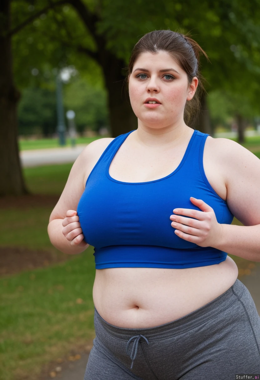(22-year-old) German girl, attractive, symmetrical-face, good-features, blue-eyes, brunette, Alexandra-daddario fat-face, double chin, adipose, chubby-cheeks natural look, no-makeup, curvy, fertile, (fat), (400lbs), short, topheavy, huge-chest wearing a tight blue sports top, grey plus-size sweatpants , running in a park, exercise, ((sweating, out of breath, huffing and puffing, red-faced, wheezing)) 4k-masterpiece, best-quality, good-lighting, film-grain, bokeh, blurry-background, three-quarter-view, candid, snapshot