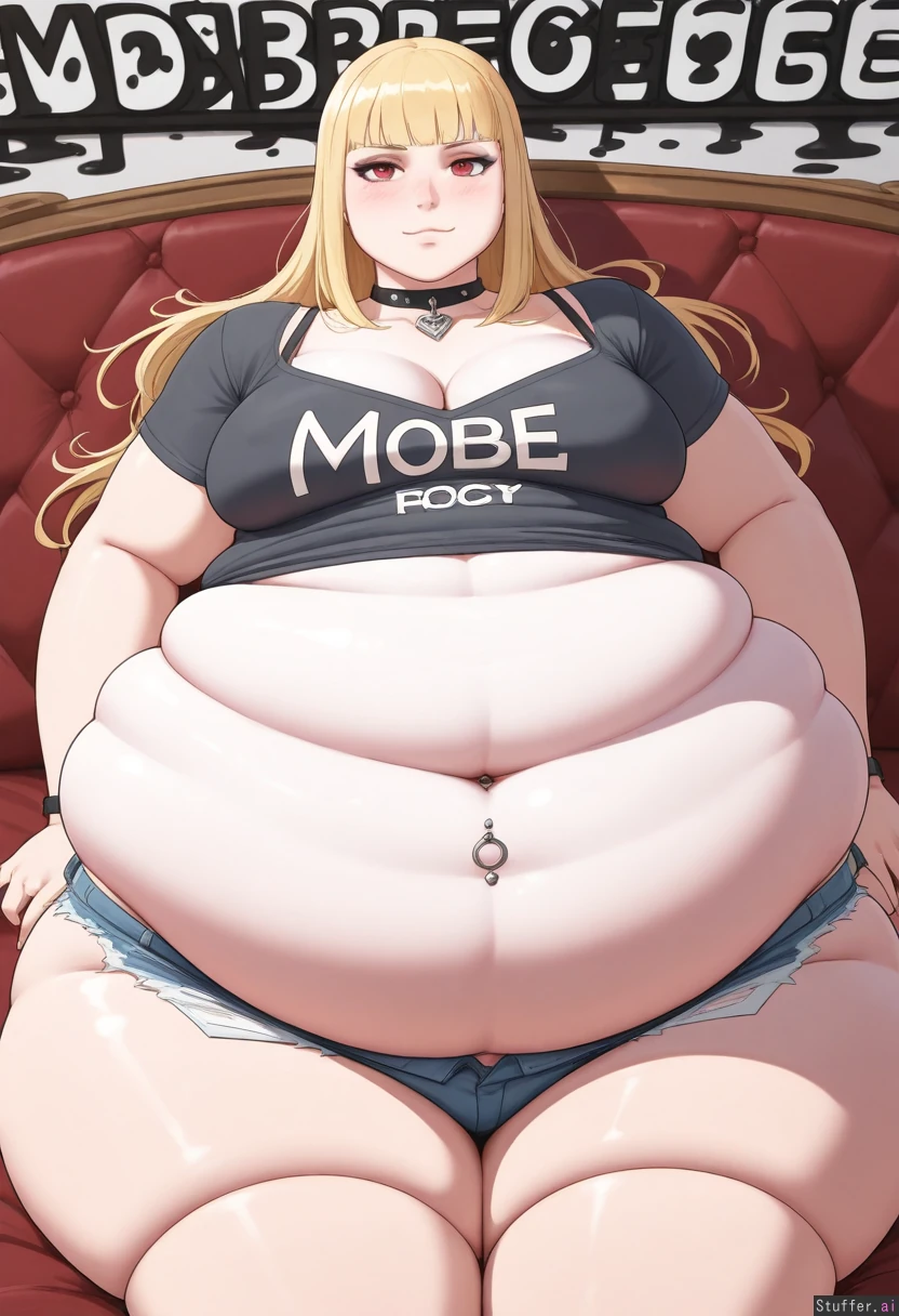 (Solo), stunning beauty, gorgeous, pale, freckles, ((eyeliner)), blonde hair, long straight hair, blunt bangs, scarlet eyes, (blushing), choker, medium breasts, ((thicker thighs)), ((adult)), thong showing, (navel piercing), ((punk)) krekkov, reiq, kittew, ripped shorts (((fat rolls, massive fat hips, bottom heavy:1.3))), (((midriff peek))), (drunk), laying on couch, ((((((((morbidly_obese))))))))
