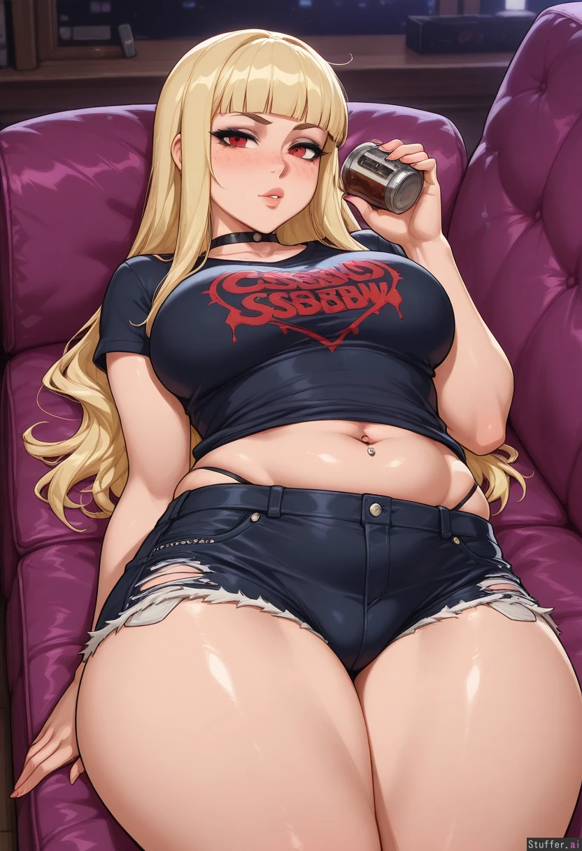 (Solo), stunning beauty, gorgeous, pale, freckles, ((eyeliner)), blonde hair, long straight hair, blunt bangs, scarlet eyes, (blushing), choker, medium breasts, ((thicker thighs)), ((adult)), thong showing, (navel piercing), ((punk)) krekkov, reiq, kittew, ripped shorts (((fat rolls, massive fat hips, bottom heavy:1.3))), (((midriff peek))), (drunk), laying on couch, ((((((((ssbbw))))))))