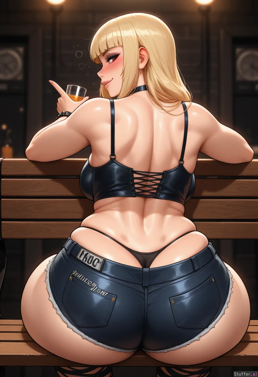 (Solo), stunning beauty, gorgeous, ((eyeliner)), long blonde hair, blunt bangs, scarlet eyes, (blushing), choker, medium breasts, ((thicker thighs)), ((adult)), thong showing, ((punk)), looking at viewer, smiling krekkov, reiq, kittew, ripped shorts (((wide hips:1.4))), (drunk), sitting on bench, ((((back rolls)))), ((((obese))))