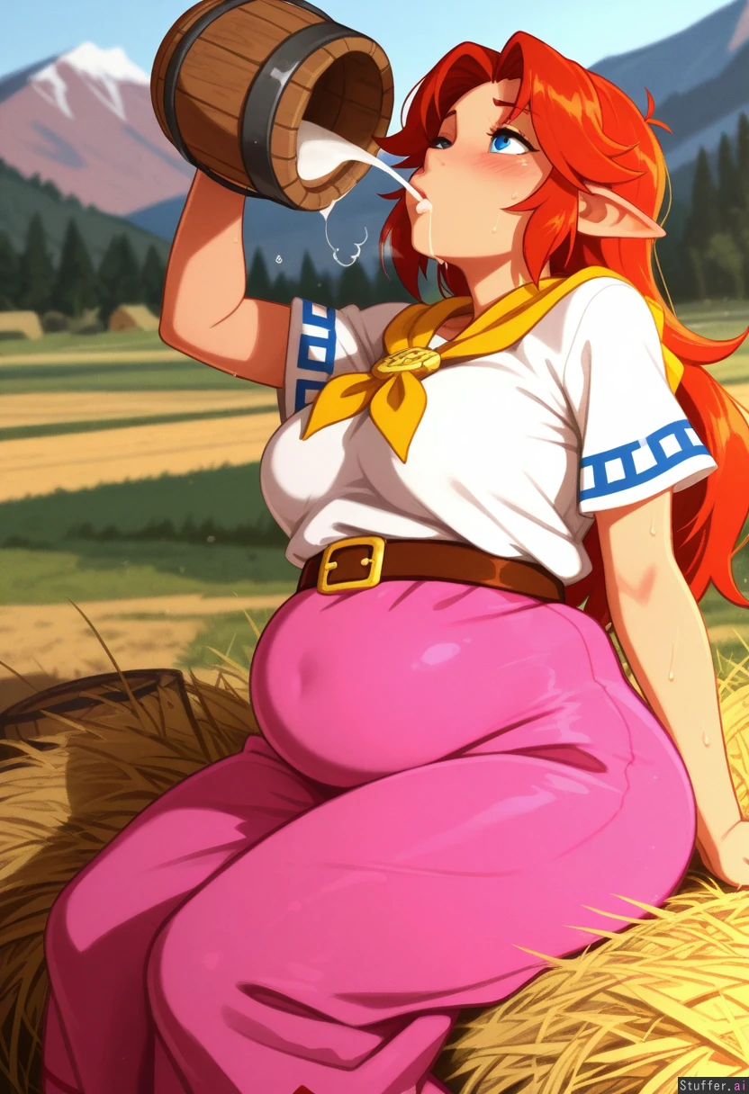 absurdres, 8k, perfect anatomy, cute, masterpiece, beautiful face, beautiful eyes, simple lighting, vibrant shading, vibrant colors, lewdlemage, pudgeruffian(artist), (khyle:1.1), (tall female:1.1), (1girl), solo, (mature), (Malon), hylian, long red hair, (white shirt), yellow neckerchief), belt, (pink skirt, long skirt), curtained hair, round eyes, blue eyes, (luscious big lips), (chubby:1), side view, wide view, (Large breasts), belly under clothes, (modest clothing), bloated belly, thick thighs, chubby cheeks, Sitting on hay bale, exhausted, ((sweating:1.2)), out of breath, puff of air, furrowed brow, (big wooden bucket covering face, gushing milk pouring into mouth, drinking wooden bucket milk, chugging:1.2), head back, looking up, hungry, blushing, Outside, mountains, (farm), open field, early morning,
