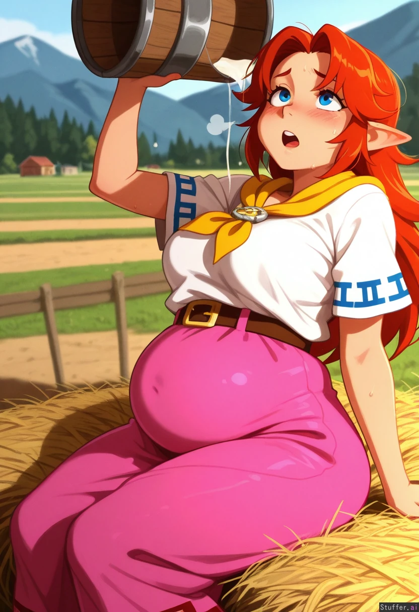 absurdres, 8k, perfect anatomy, cute, masterpiece, beautiful face, beautiful eyes, simple lighting, vibrant shading, vibrant colors, lewdlemage, pudgeruffian(artist), (khyle:1.1), (tall female:1.1), (1girl), solo, (mature), (Malon), hylian, long red hair, (white shirt), yellow neckerchief), belt, (pink skirt, long skirt), curtained hair, round eyes, blue eyes, (luscious big lips), (chubby:1), side view, wide view, (Large breasts), belly under clothes, (modest clothing), bloated belly, thick thighs, chubby cheeks, Sitting on hay bale, exhausted, ((sweating:1.2)), out of breath, puff of air, furrowed brow, (holding wooden bucket over head, open mouth, milk pouring into mouth, head back, looking up, hungry, blushing, Outside, mountains, (farm), open field, early morning,