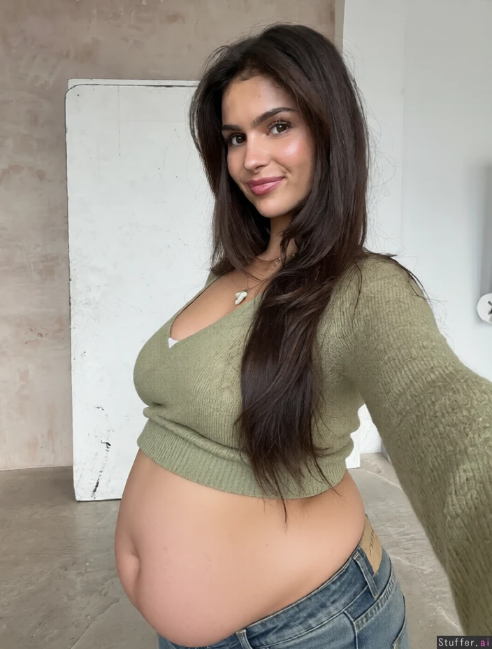 Make her slightly overweight with most weight going to her midsection, don't change the face, make her midsection a lot fatter, make her midsection extremely plump,