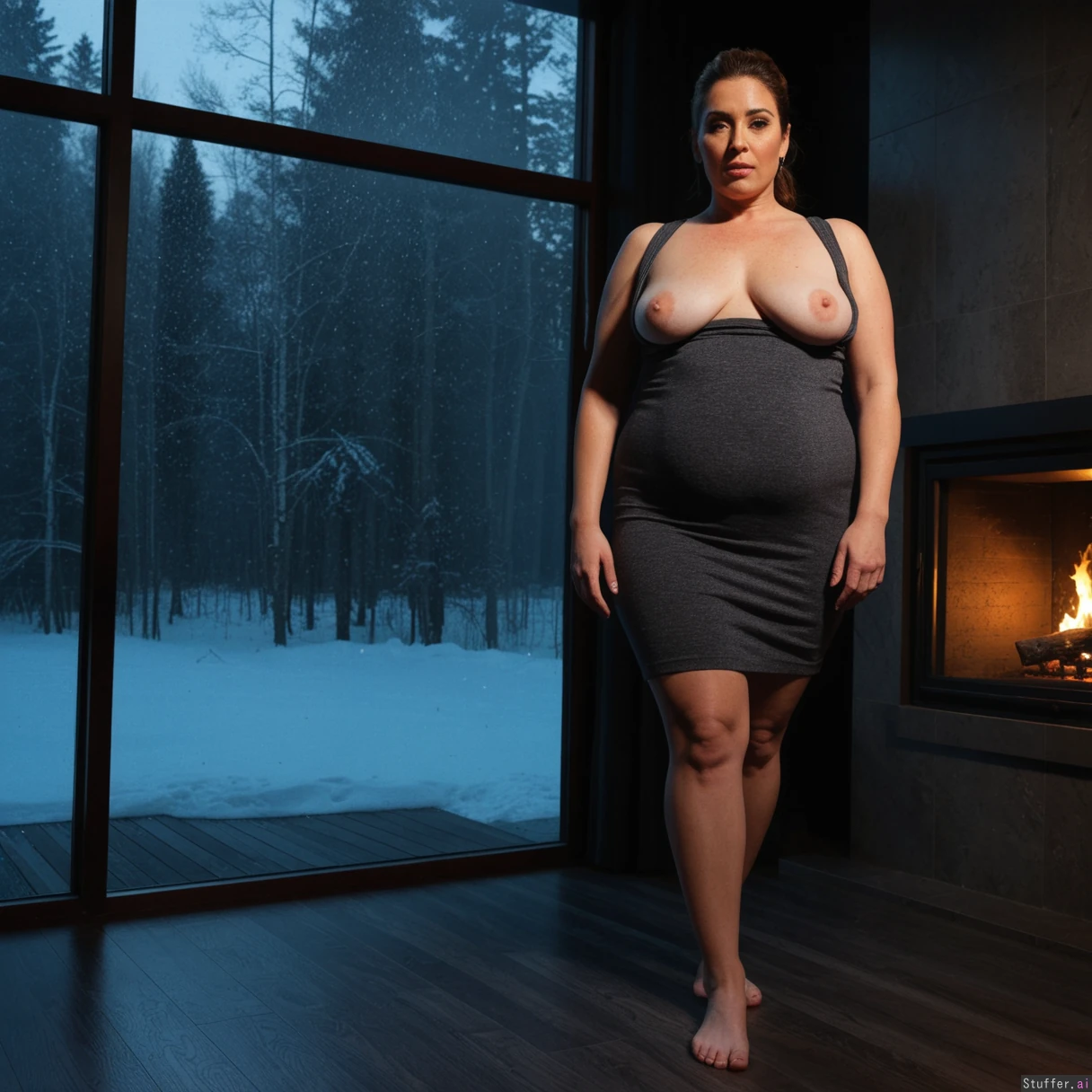 (A vintage portrait of subject walking casually under sun, snow effects, high contrast, cinematic set in forest style, emotional intensity), Extremely detailed ,(Middle aged hot milf, hot eyes,big_cheekbones,fat_lips,thick_eyebrows), (small tits,plump,bigass,fat arms, massive fat belly:1.1), (wearing shirtdress clothing outfit ,fully clothed:1.0) ,(, looking desperately at viewer), (cinematic realistic universe:1.4),(feet, fullbody view :1.6), massive wooden modern glass house, fireplace, moody atmosphere, lake,(Amazona :1.4),one source light,fire light reflect on her,.