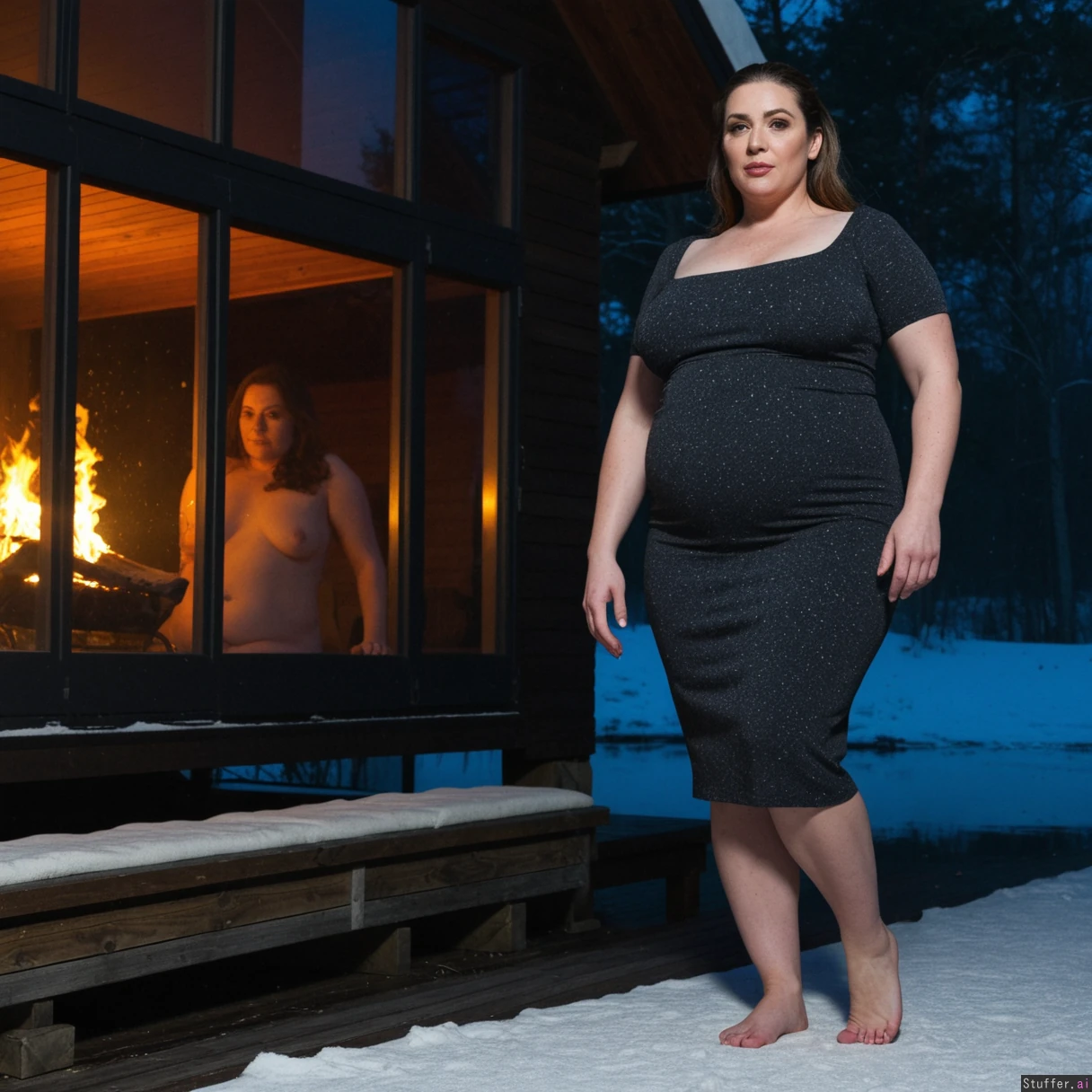 (A vintage portrait of subject walking casually under sun, snow effects, high contrast, cinematic set in forest style, emotional intensity), Extremely detailed ,(Middle aged hot milf, hot eyes,big_cheekbones,fat_lips,thick_eyebrows), (small tits,plump,bigass,fat arms, massive fat belly:1.1), (wearing shirtdress clothing outfit ,fully clothed:1.0) ,(, looking desperately at viewer), (cinematic realistic universe:1.4),(feet, fullbody view :1.6), massive wooden modern glass house, fireplace, moody atmosphere, lake,(Amazona :1.4),one source light,fire light reflect on her,night.