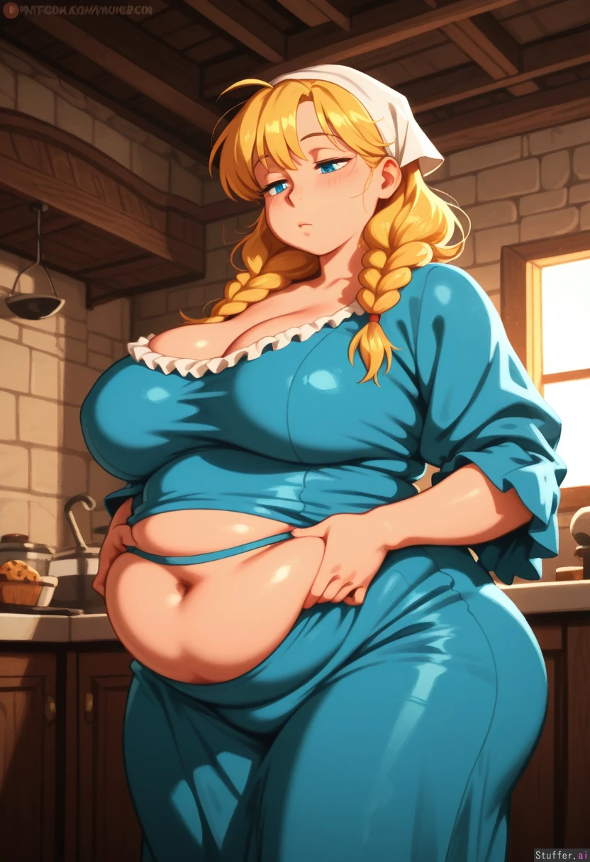 absurdres, 8k, perfect anatomy, cute, masterpiece, beautiful face, beautiful eyes, simple lighting, khyle. , noodlenood , colo, gardegu, (tall female:1.1), 1girl, solo, mature, Blonde hair, blue eyes, braided pigtails, double ponytails, long hair, white bandanna , blue dress, frilled collar , medieval kitchen, (modest clothing:1.2) , (((fat double belly))), ((muffin top)) , ((large fat breasts)), ((fat wide ass, wide hips)) , (horny), bored, standing straight, looking down at belly, grabbing belly, weight_gain , side_view , standing , chubby_cheeks , round belly, fat, wide_hips, tight_clothing , soft,( soft belly:1.1) , double_chin , weight_conscious, big_belly, (thick body:1.4) , love_handles , fat arms, bloated