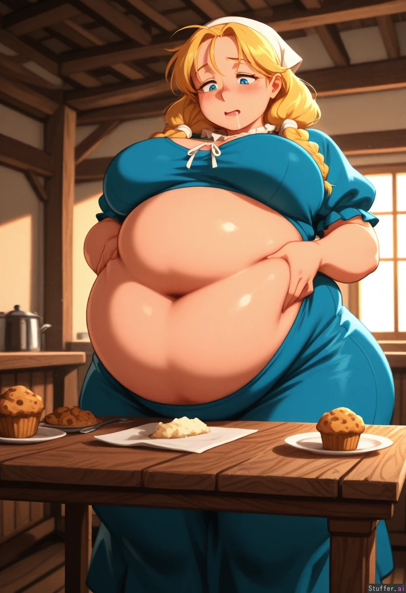 absurdres, 8k, perfect anatomy, cute, masterpiece, beautiful face, beautiful eyes, simple lighting, khyle. , noodlenood , colo, gardegu, (tall female:1.1), 1girl, solo, mature, Blonde hair, blue eyes, braided pigtails, double ponytails, long hair, white bandanna , blue dress, frilled collar , medieval kitchen, (modest clothing:1.2) , ((fat double belly)), (muffin top) , (large fat breasts), (fat wide ass, wide hips, fat thick thighs) , (belly on table, underbelly on table, her fat belly is on the table, she places her belly on the table), (horny, drooling, moaning), standing straight, looking down at belly, grabbing belly, weight_gain , ((side_view)) , standing , chubby_cheeks , round belly, fat, wide_hips, tight_clothing , soft,( soft belly:1.1) , double_chin , weight_conscious, big_belly, (thick body:1.4) , love_handles , fat arms, bloated