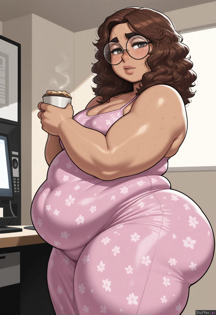 Solo, Krekkov(artist),((1girl, short brow wavy hair, curvy body, tan skin, round glasses, pink Floral dress )), horny, ((tight clothes)), ((plump lips)), (blushing face), (sexy pose, sexy), shy, at a office, (flatchest), (1small_breasts), side view, standing, drinking coffee, Dramatic lighting, (Thick_body:1.87), (chubby_arms:1.51), (fat_legs:1.06), ((fat double belly)), ((muffin top)), ((wide hips)), ((fat ass)) ((looking at viewer))